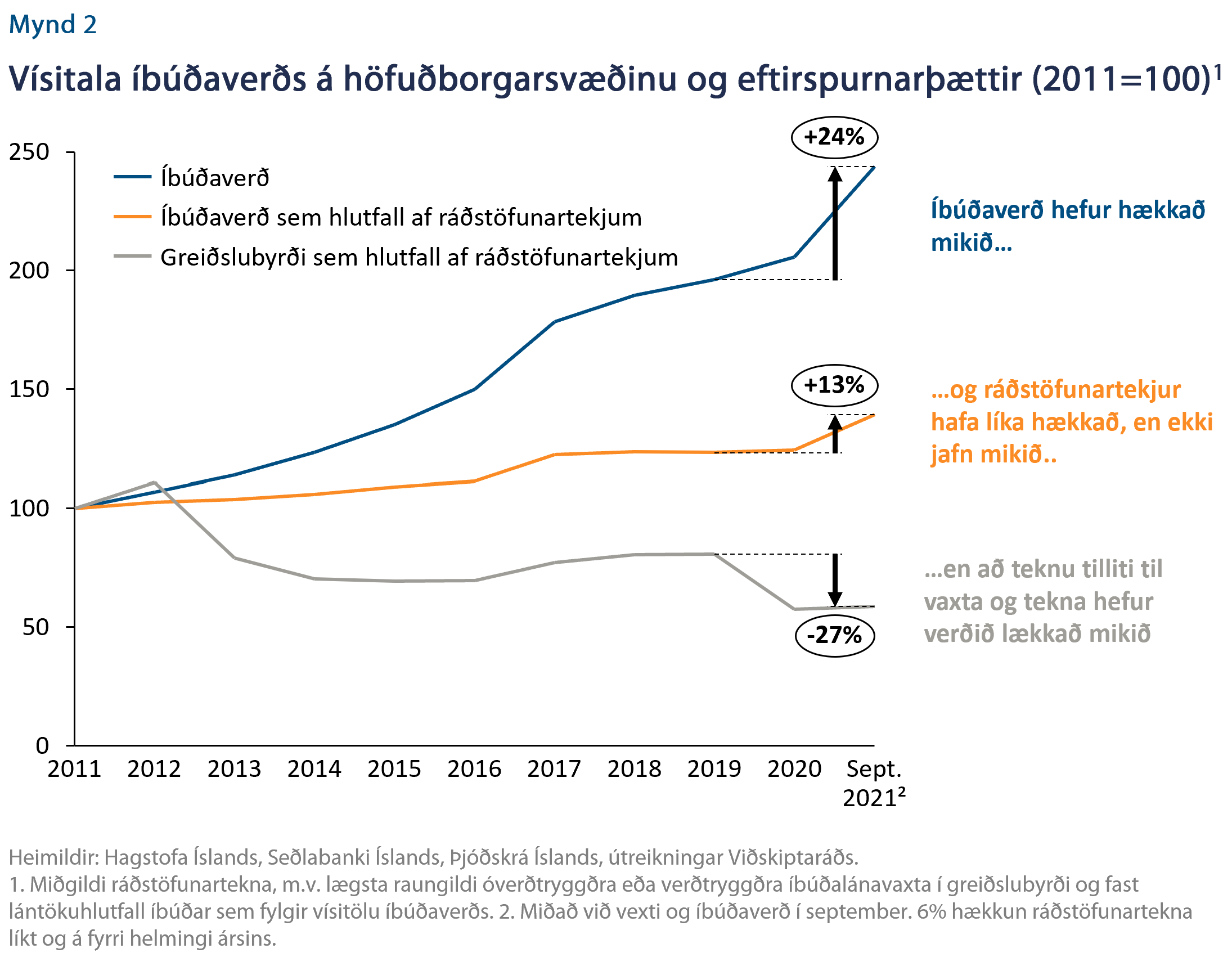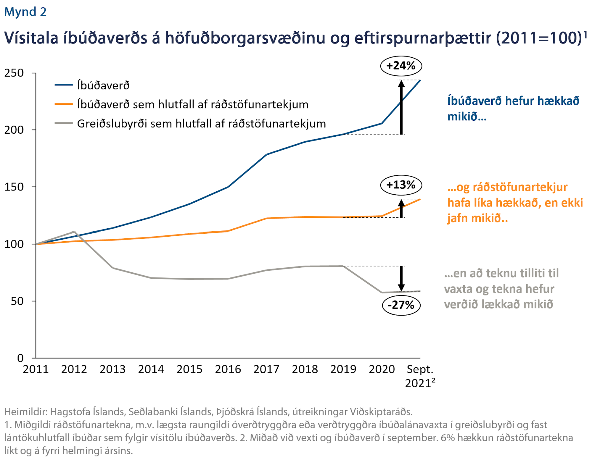 Eftirspurn á húsnæðismarkaði ræðst annars vegar af greiðsluvilja, hversu háu hlutfalli tekna fólk er reiðubúið að verja í húsnæði, og hins vegar af getu til að reiða fram útborgun og standa undir greiðslubyrði. Það síðarnefnda ræðst að mestu leyti af tekjum. Þó að íbúðaverð á höfuðborgarsvæðinu hafi hækkað um 143% frá 2011 hefur það hækkað töluvert minna í samhengi við ráðstöfunartekjur, eða 39% og þar af 19% frá 2019 (mynd 2). Þetta er töluverð hækkun umfram tekjur og hefur oft reynst freistandi að draga þá ályktun að íbúðaverð sé mjög hátt í samhengi hlutanna. Með þessu er þó bara hálf sagan sögð. Eignaverð, ekki hvað síst fasteignaverð, ræðst líka að miklu leyti af vaxtaþróun og með lægri vöxtum hækkar eignaverð. Það hefur einmitt verið þróunin hér á landi þannig að óverðtryggðir íbúðalánavextir eru nú um tveimur prósentustigum lægri en árið 2019 og þremur prósentustigum lægri en árið 2013. Þetta þýðir að greiðslubyrði, að teknu tilliti til tekna og verðþróunar, hefur lækkað um 27% frá 2019 og hefur líklega ekki verið lægri á þessari öld. Það hafa því að öllum líkindum verið gríðarlega sterkir kraftar vaxtalækkana sem hafa átt stóran þátt í miklum hækkunum síðustu mánuði, sem er í takt við reynslu annarra ríkja.