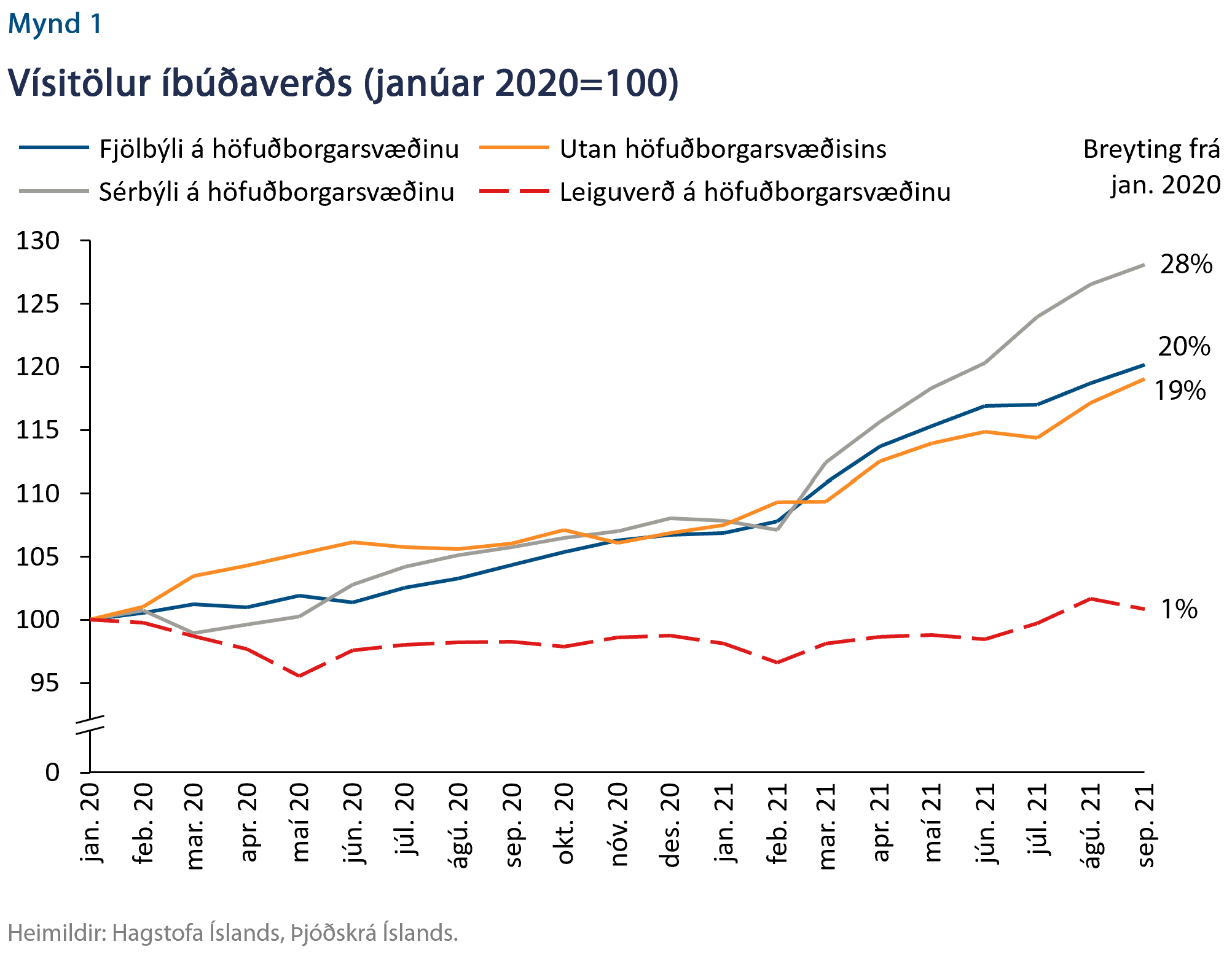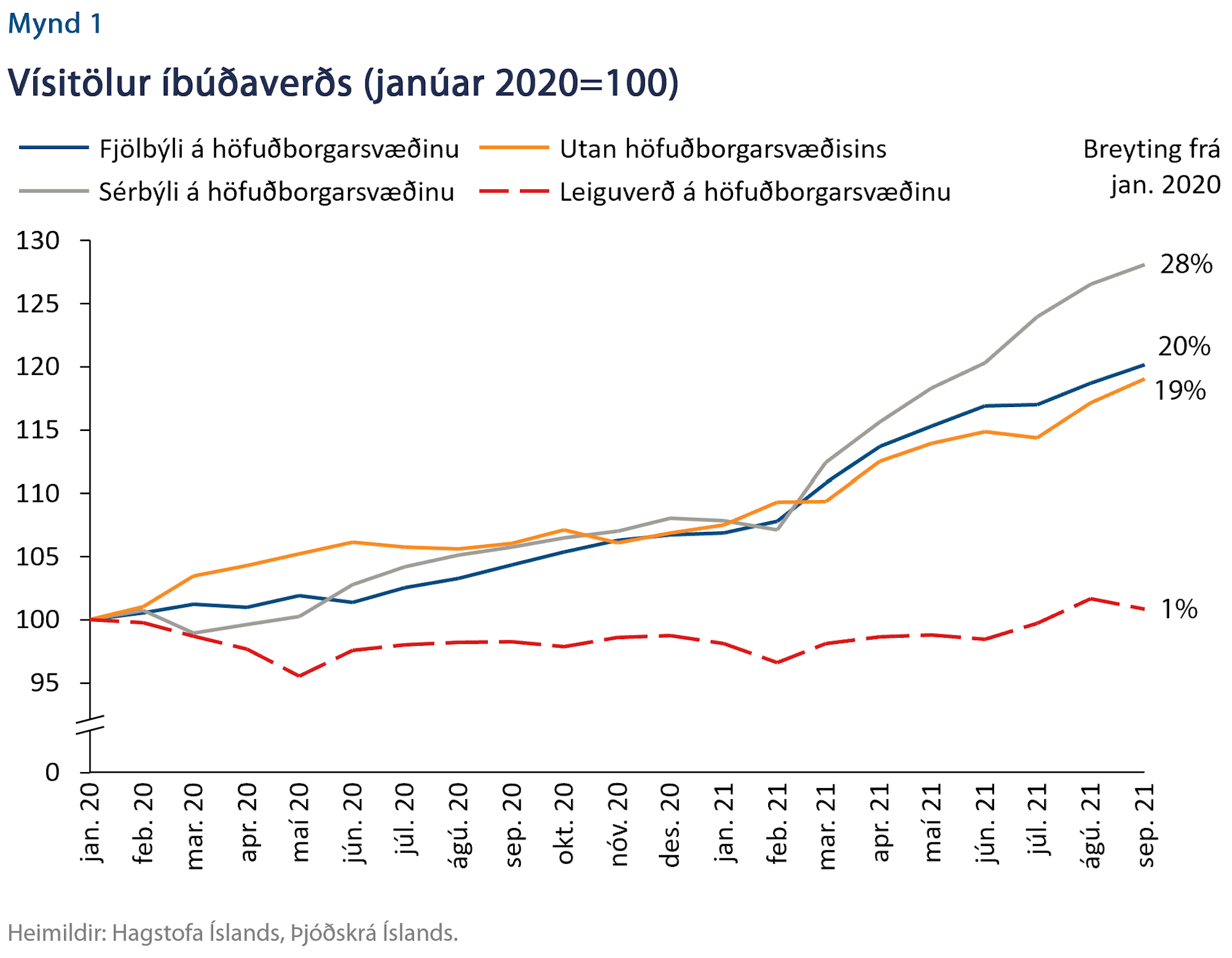 Allt þetta breyttist í kjölfar þess að heimsfaraldurinn skall á af fullum þunga í mars 2020. Um mitt ár 2020 fór að bera á aukinni veltu auk styttri sölutíma og er leið á árið fylgdu hraðari verðhækkanir í kjölfarið, en á höfuðborgarsvæðinu voru þær um 3,6% milli ára í mars en 6% í október. Þessi þróun kom svo fram af fullum krafti á þessu ári og hefur íbúðaverð nú hækkað um 15% milli ára á landinu öllu, þar af 21% í sérbýli á höfuðborgarsvæðinu (mynd 1). Öðru gegnir um leiguverð sem hefur nánast staðið í stað frá ársbyrjun 2020.