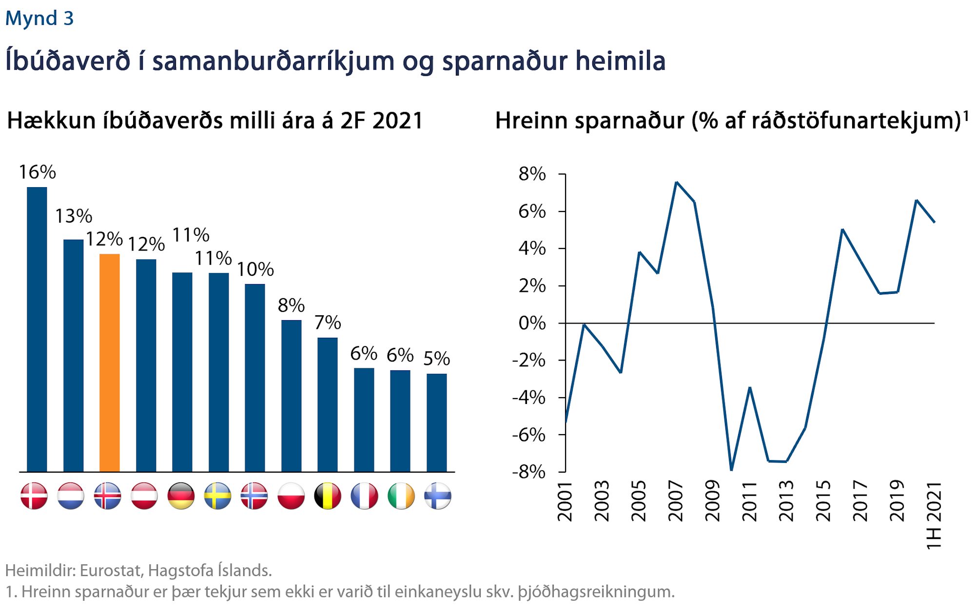 Hér er ekki öll sagan sögð. Áhrif vaxtalækkana geta tekið nokkurn tíma að koma fram, meðal annars því aðrir þættir, eins og útborgun, geta hamlað greiðslugetu. Að auki eru íbúðaverðshækkanir hér á landi mjög svipaðar og í samanburðarlöndum, sérstaklega ef haft er í huga að vextir hafa lækkað sérstaklega mikið hér á landi síðustu misseri (mynd 3). Því virðist sem eitthvað fleira gæti verið á ferðinni. Þar liggja áhrif heimsfaraldursins sjálfs beinast við. Annars vegar hefur fólk varið mun meiri tíma heima síðustu misseri og tók upp á að stunda vinnu og líkamsrækt heima, nokkuð sem þekktist síður áður. Það ætti því ekki að koma á óvart að fólk sé tilbúið að greiða meira og fyrir stærra húsnæði, sem hér á landi birtist í meiri hækkunum á sérbýli en fjölbýli. Hins vegar hefur faraldurinn takmarkað aðra neyslumöguleika fólks, eins og utanlandsferðir og skemmtanir, og þvingað fram aukinn sparnað bæði hér á landi og erlendis. Óháð launahækkunum og vaxtalækkunum virðist því sem þessi áhrif hafi leitt milljarða króna inn á markaðinn, aukið eftirspurn og leitt til næstmesta fjölda viðskipta frá upphafi. Um nákvæmt umfang áhrifanna er erfiðara að segja.