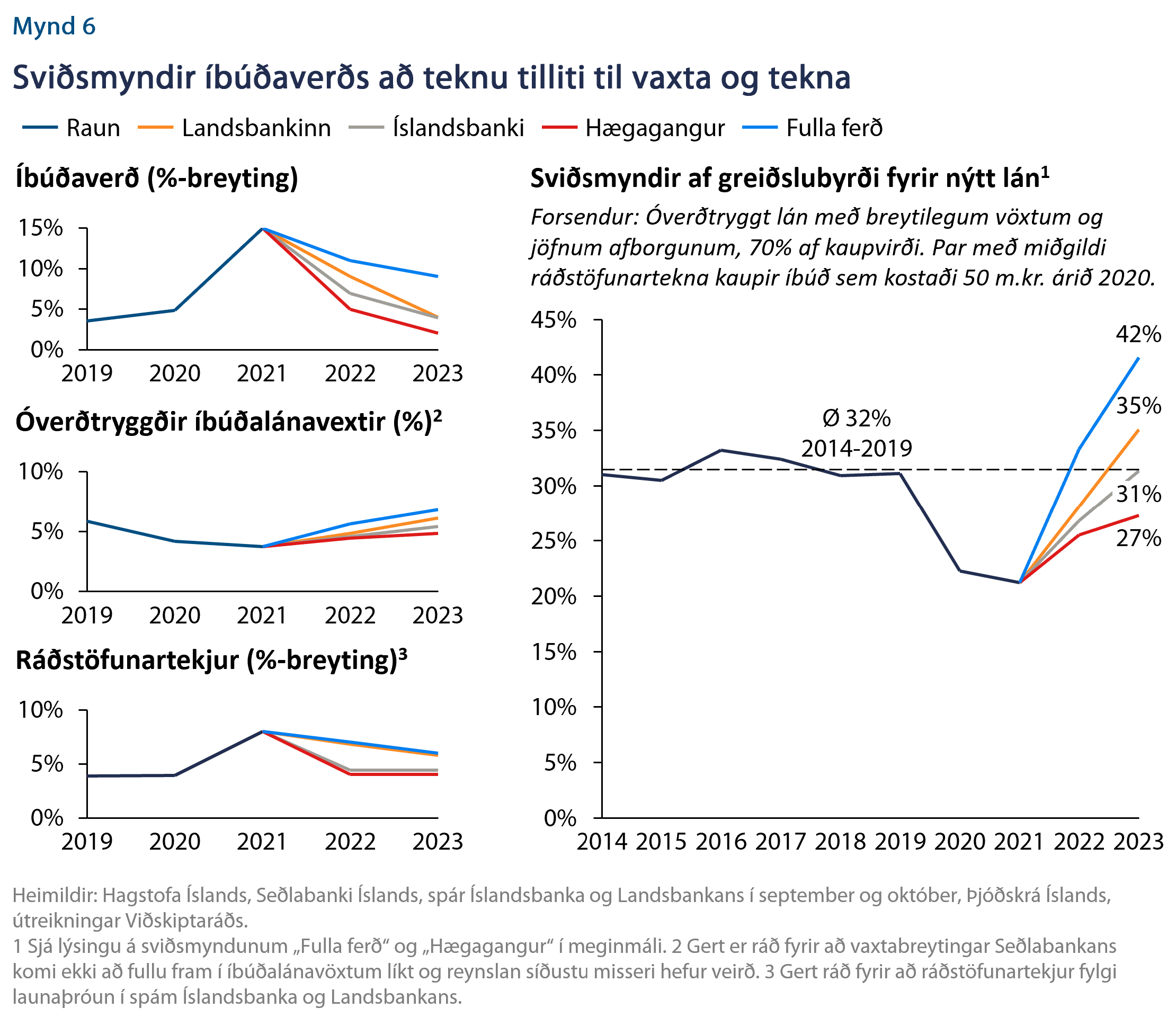 Sviðsmyndin Fulla ferð gerir ráð fyrir að hagkerfið og verðlag verði á fljúgandi siglingu, íbúðaverð muni áfram hækka mjög hratt, um 10% á ári að nafnvirði og að ráðstöfunartekjur hækki einnig mikið en vegna þenslu og verðbólgu þurfi Seðlabankinn að hækka vexti upp í 5% árið 2023. Þetta myndi leiða til þess að greiðslubyrðin hækkaði mjög mikið og yrði um þriðjungi hærri en að meðaltali 2014-2019, sem virðist heldur ólíklegt. Hægagangur gerir aftur á móti ráð fyrir tiltölulega hóflegum launa- og verðhækkunum svo að íbúðalánavextir hækka aðeins um eitt prósentustig til ársins 2023. Í þeirri sviðsmynd hækkar greiðslubyrðin um 29% en verður þó 13% lægri en árin 2014-2019.