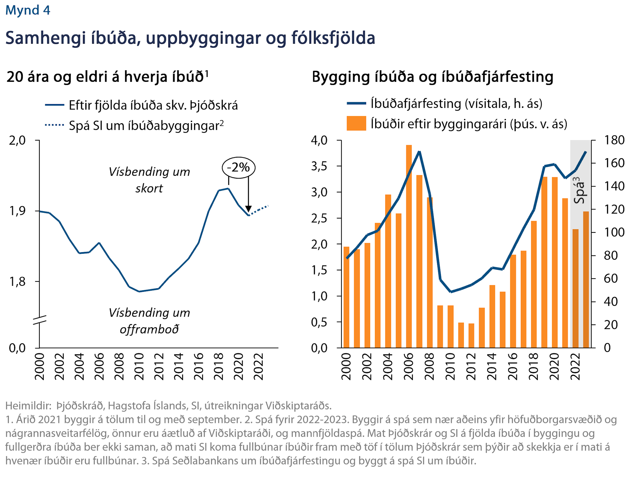 Upp á síðkastið hefur umræðan um fasteignamarkaðinn að miklu leyti snúist um skort á nýjum íbúðum. Sveitarfélög hafa verið gagnrýnd fyrir framboðsskort á lóðum og bankar fyrir skort á útlánum til byggingaraðila. Jafnvel hefur framboðsskorturinn verið nefndur sem orsök verðhækkana síðustu missera, þrátt fyrir það sem var rakið hér að framan um þróun eftirspurnar og að almennt gekk hægt að selja nýjar íbúðir fram á árið 2020. Staðreyndin er enda sú að íbúðum hefur fjölgað meira en íbúum frá árinu 2019 og því hefur breytingin á framboði íbúða lagst gegn öðrum þáttum sem hafa stuðlað að verðhækkunum (mynd 4). Hér er notast við einstaklinga 20 ára og eldri á íbúð, enda nauðsynlegt að taka tillit til þess að börnum hefur fækkað hlutfallslega, sem skekkir annars myndina yfir svo langt tímabil þar sem börn þurfa ekki eigin íbúð.