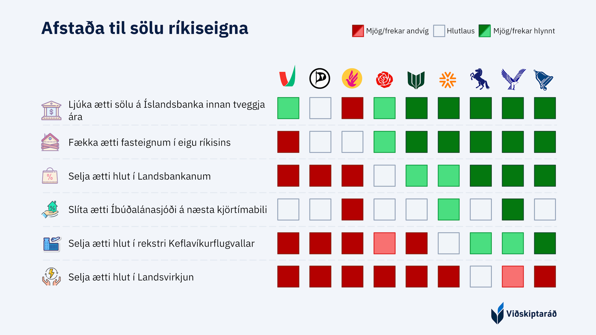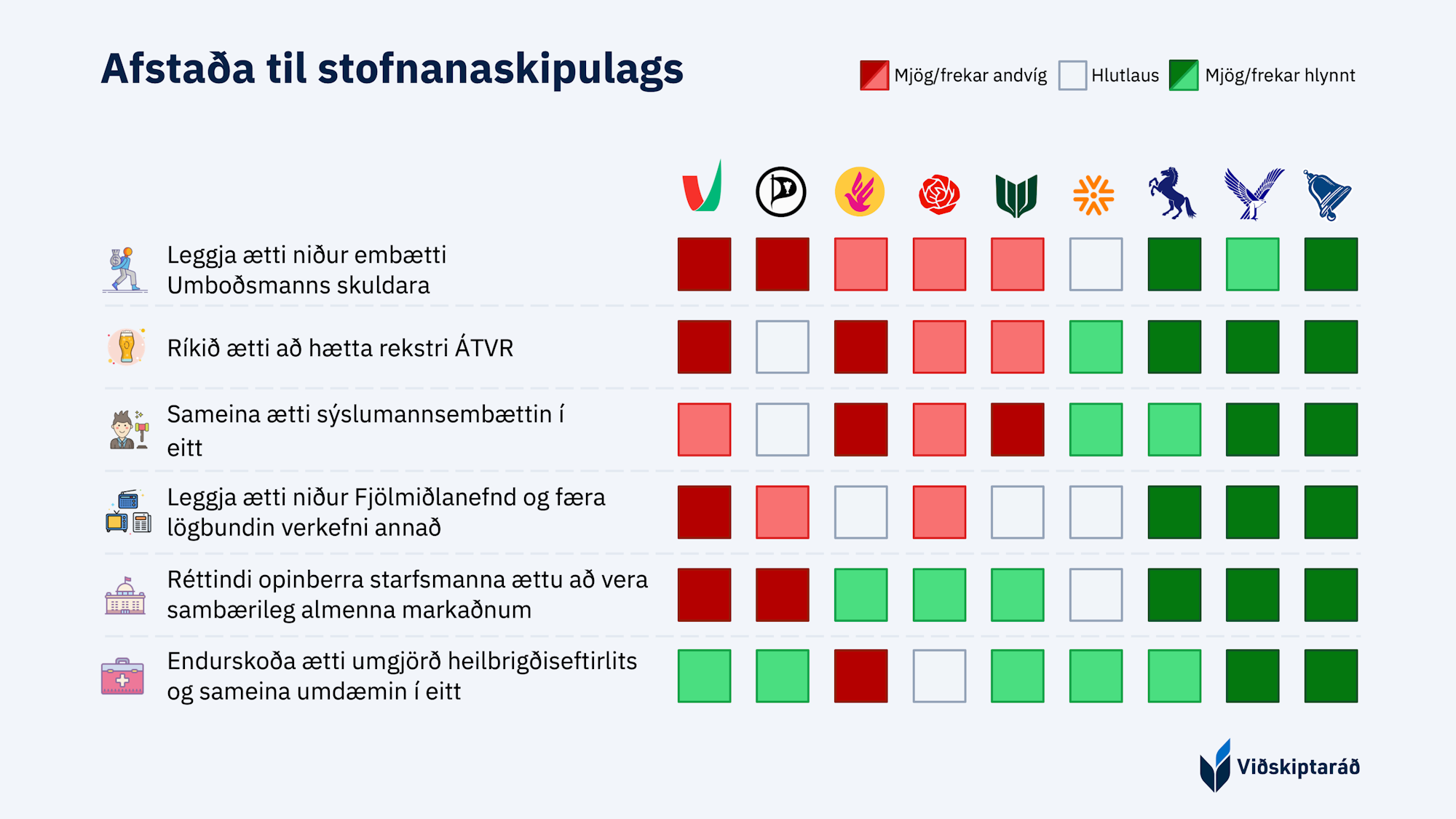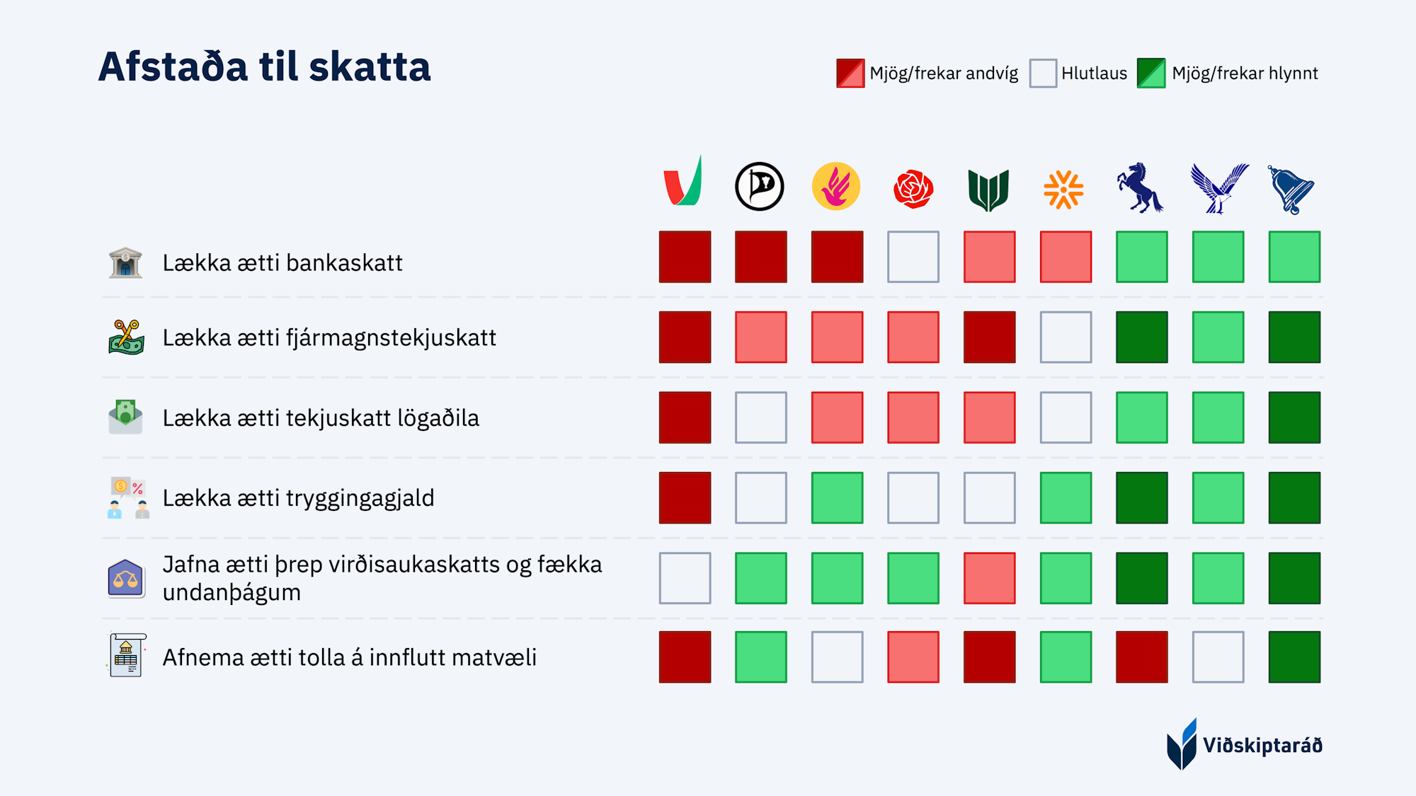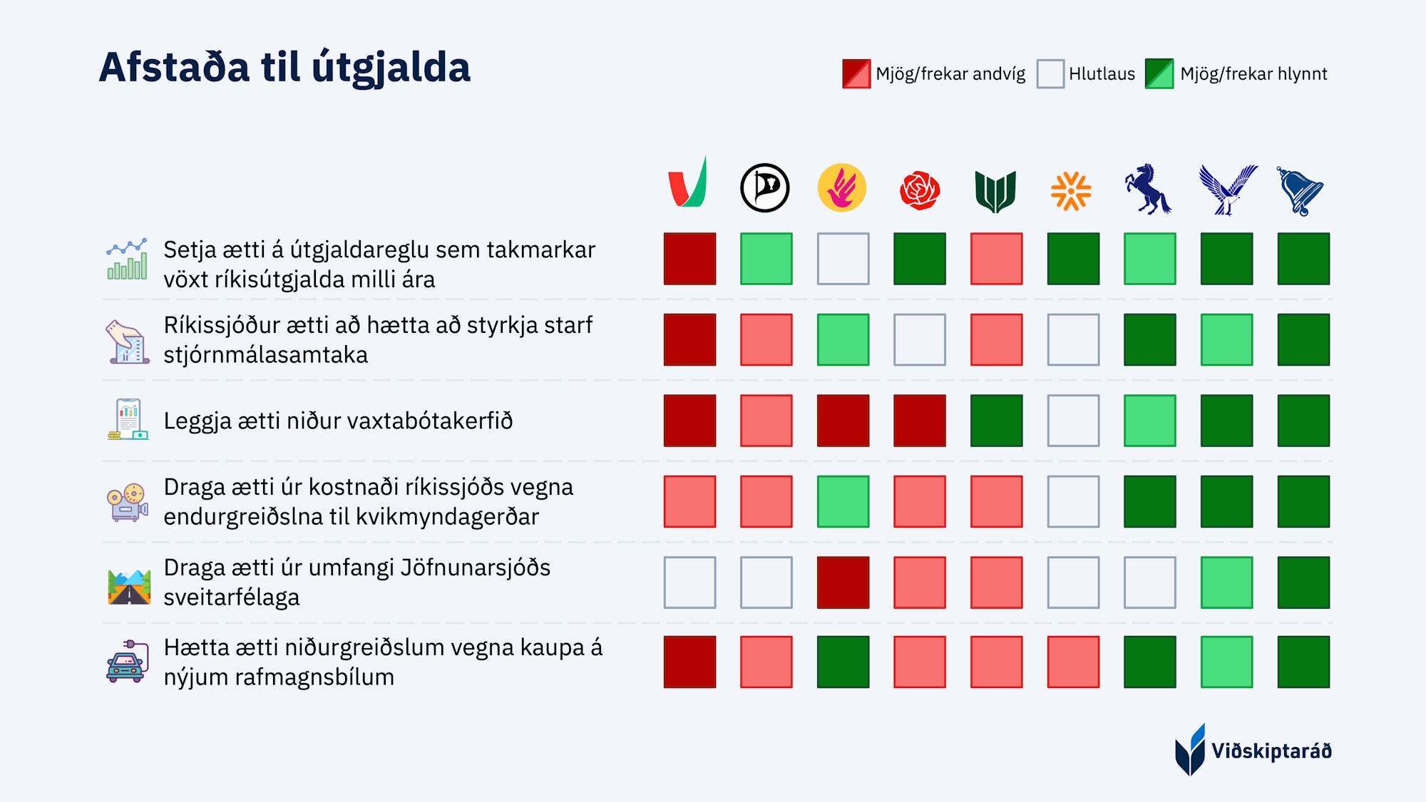Á eftirfarandi myndum má sjá afstöðu framboðanna í sjö málaflokkum, en þeir eru skattar, útgjöld, sala ríkiseigna, stofnanaskipulag, atvinnuvegir, regluverk og grunnstoðir.
