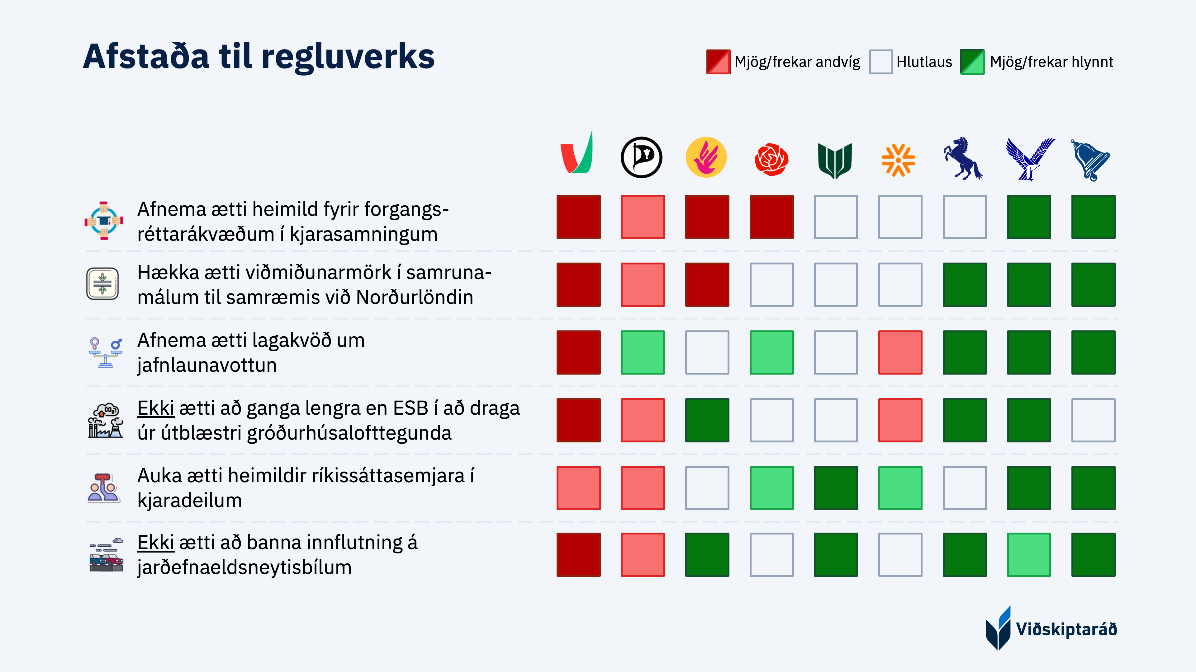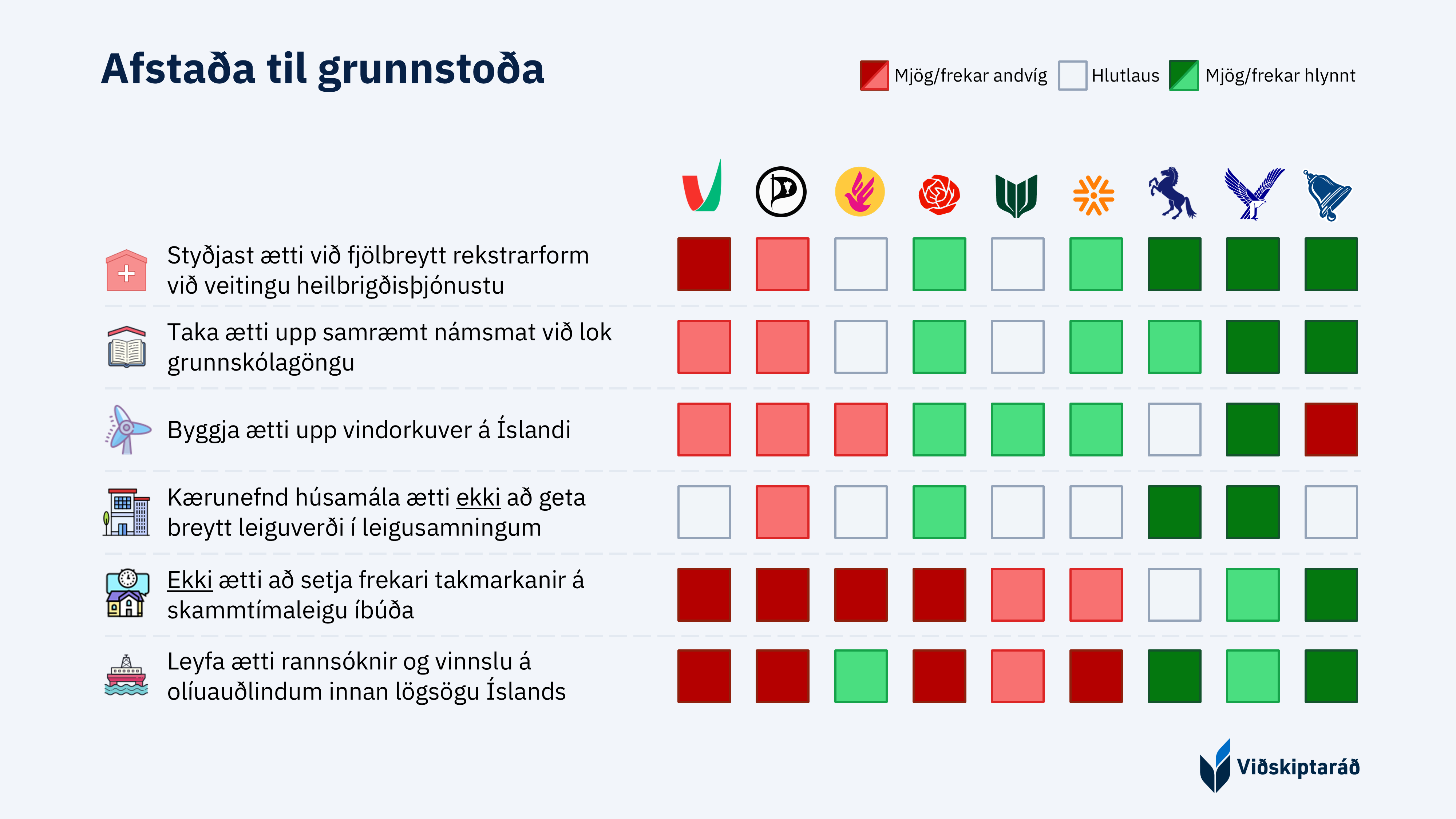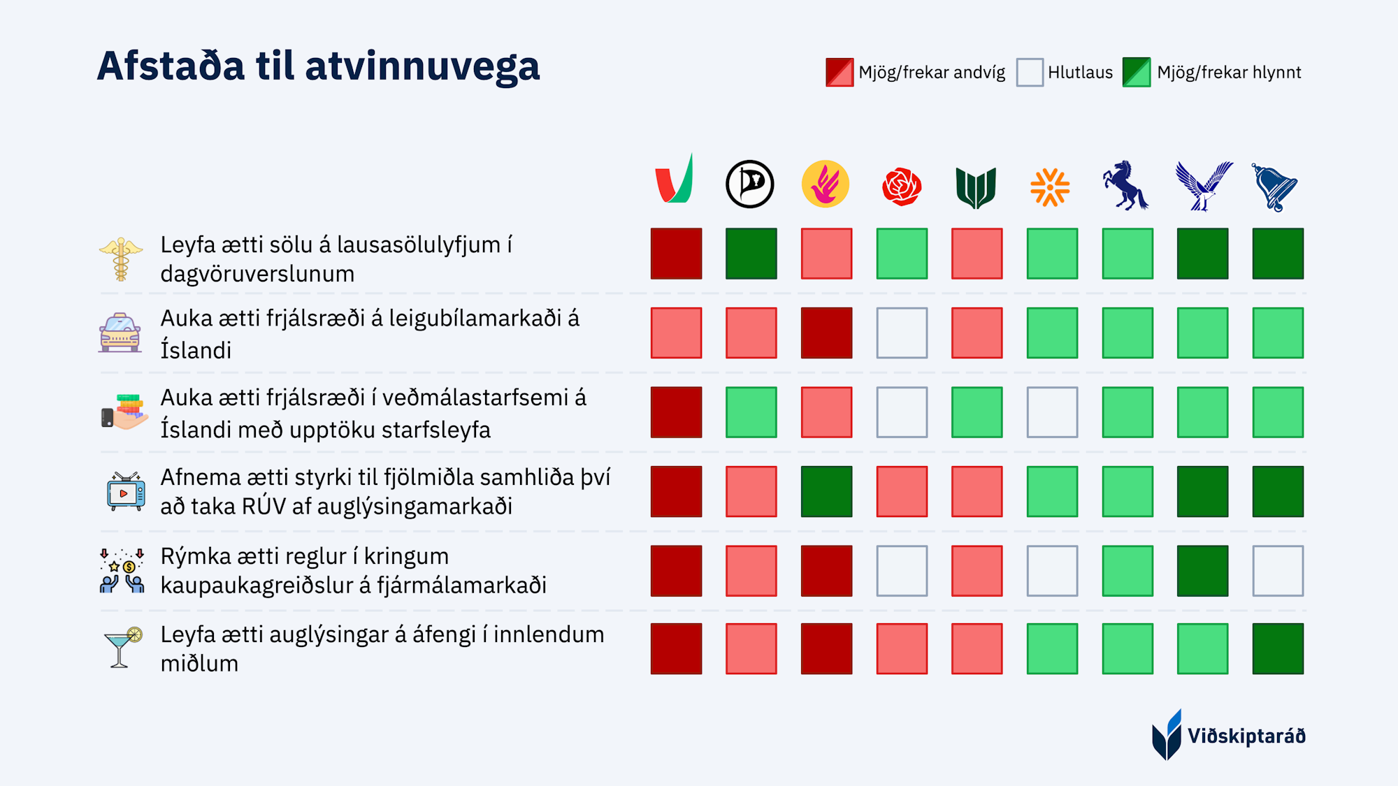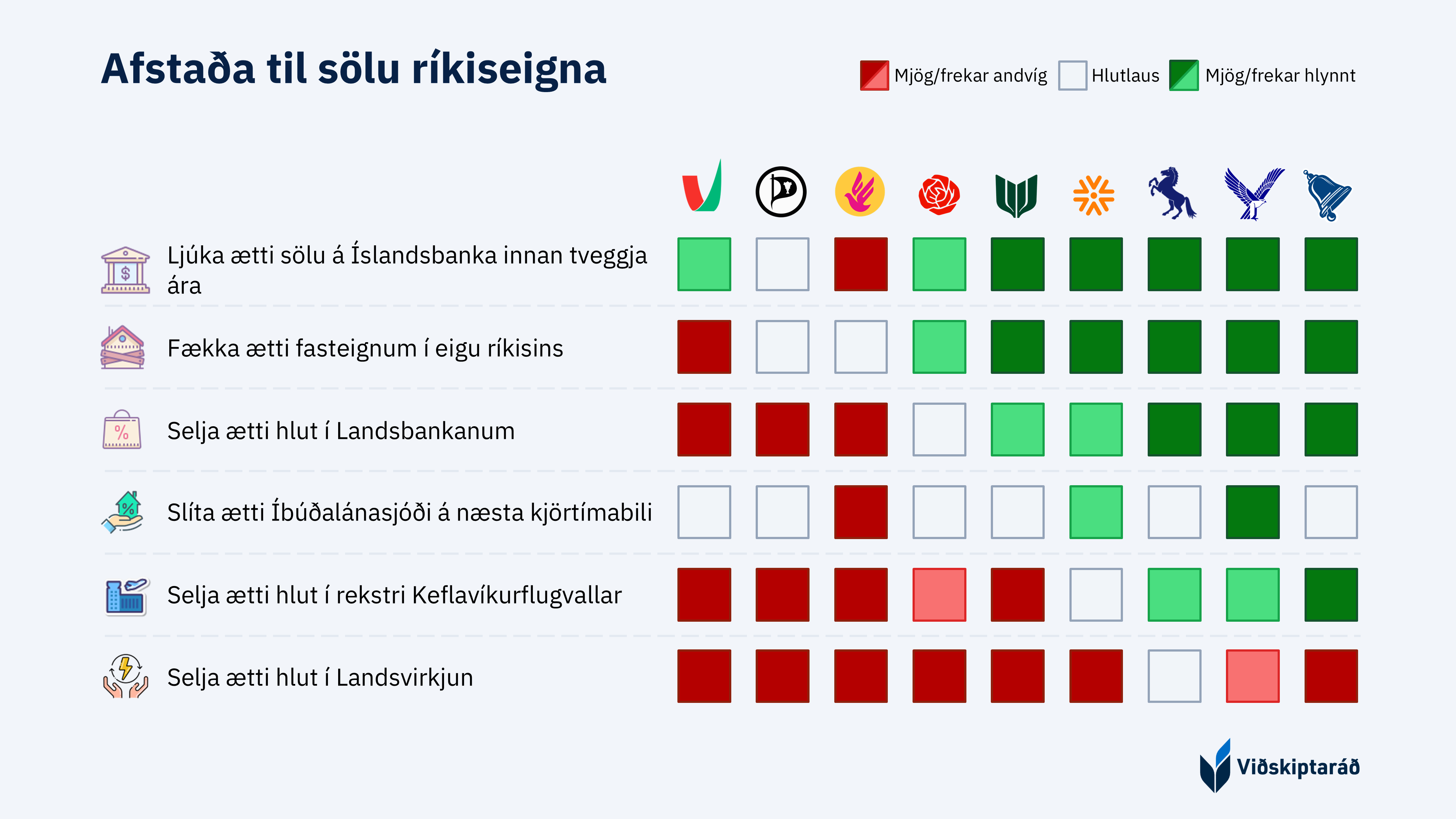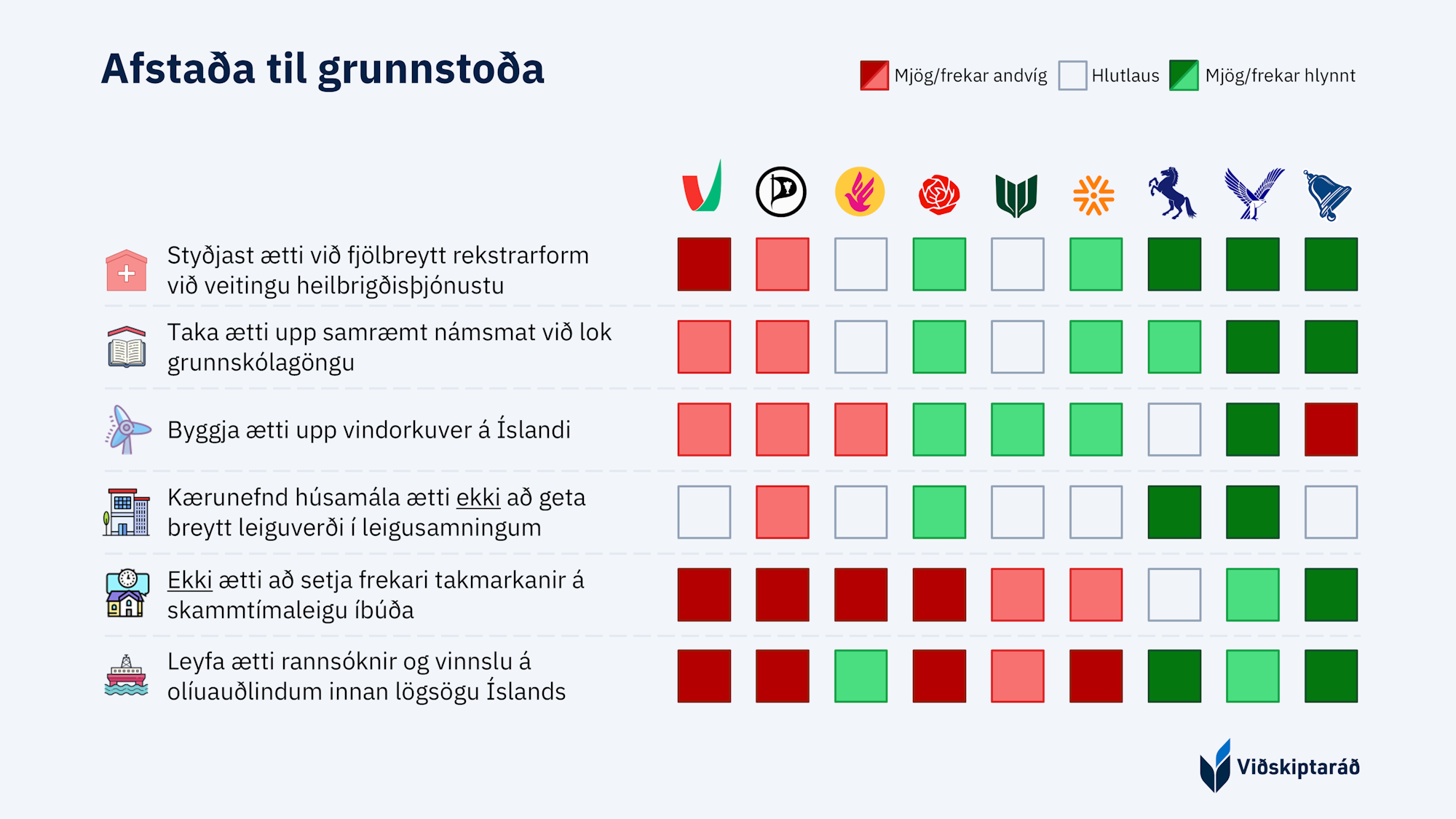 Á eftirfarandi myndum má sjá afstöðu framboðanna í sjö málaflokkum, en þeir eru skattar, útgjöld, sala ríkiseigna, stofnanaskipulag, atvinnuvegir, regluverk og grunnstoðir.