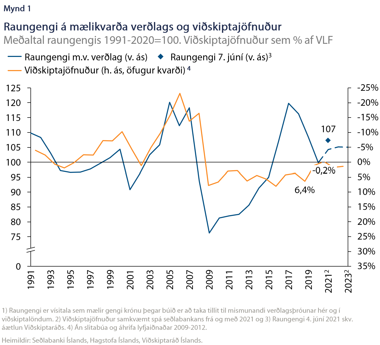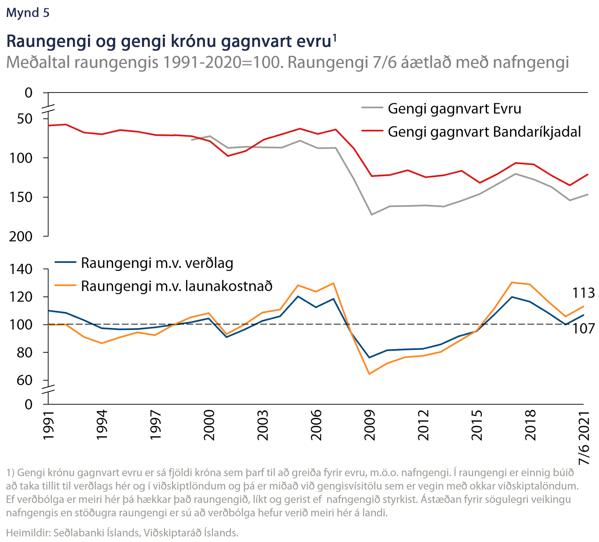 Eins og fram kom hér að framan eru sterkar vísbendingar um að hagkerfið hafi ekki getað til lengdar staðið undir gengi krónunnar á árunum 2017 til 2018. Aftur á móti virðist það gengi sem var viðvarandi síðasta eina og hálfa árið fyrir heimsfaraldurinn vera í takt við getu hagkerfisins, enda í ágætu samræmi við sögulegt meðaltal raungengis og mat Seðlabankans á svokölluðu jafnvægisraungengi.