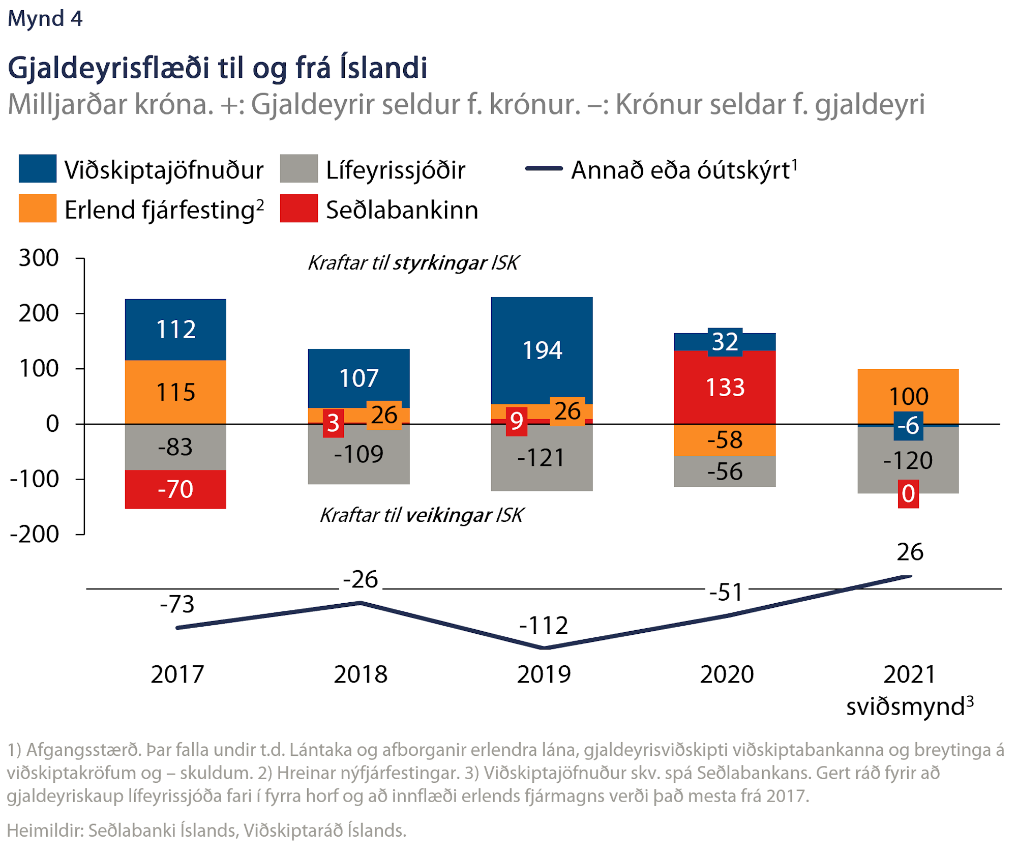 Það er líka gagnlegt að reyna að ná utan um sjálft gjaldeyrisflæðið, í anda þess sem var gert í rammagrein II-2 í Fjármálastöðugleika 2018/1 (mynd 4). Enda er ein helsta ástæðan fyrir væntingum um sterkari krónu að flæðið verði krónunni hagstætt. Á myndinni má sjá þróunina frá 2017 og svo sviðsmynd fyrir árið 2021. Í sviðsmyndinni er gengið út frá því að viðskiptahalli verði í takt við spá Seðlabankans og lífeyrissjóðir fari aftur í fyrra far í kaupum á gjaldeyri. Þar togast á annars vegar minni þörf til eignadrefingar erlendis þar sem hlutfall erlendra eigna hefur hækkað og hins vegar að sjóðirnir hafa stækkað mikið á síðustu misserum. Þá er gert ráð fyrir að Seðlabankinn verði hlutlaus í sínum inngripum og að innstreymi erlends fjármagns snúist við og verði óvenju mikið. Þegar þessir liðir eru teknir saman sést að enn vantar 26 milljarða króna annars konar gjaldeyrisinnstreymi til að jafnan gangi upp. Athuga skal að hin árin hefur þessi liður verið neikvæður svo að ef þessi sviðsmynd á að ganga upp þarf að koma óvenju mikill styrkingarþrýstingur úr öðrum áttum, hvort sem það er vegna erlendrar lántöku eða viðskipta bankanna. Gangi það ekki upp mun Seðlabankinn þurfa að sporna gegn veikingu krónunnar í ár, lífeyrissjóðir að fara út með minni fjármuni eða erlent fjármagn að streyma inn af enn meiri krafti. Þar sem hlutfall erlendra eigna lífeyrissjóða hefur hækkað mikið síðustu ár og er nú 34% er einfalt að færa rök fyrir minna útstreymi lífeyrissjóða. Til að það breyti stóru myndinni með afgerandi hætti þarf það þó að vera svipað eða minna en á síðasta ári, sem telst frekar ólíklegt.