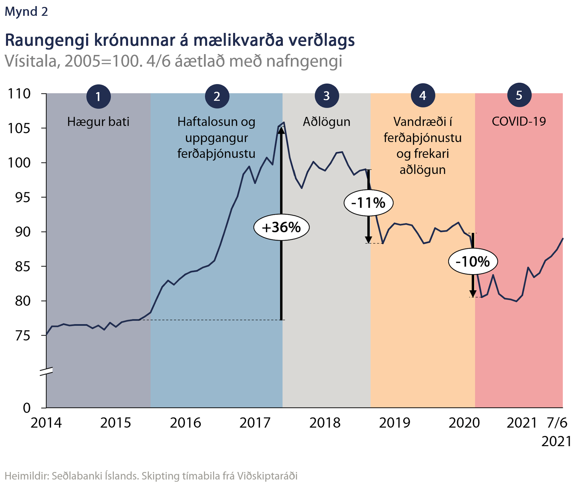 Sögulega hefur krónan sveiflast mikið og síðustu ár engin undantekning nema að sveiflurnar hafi verið minni en oft áður. Áður en lengra er haldið er gott að rifja þá þróun upp sem skipta má í fimm tímabil (mynd 2):