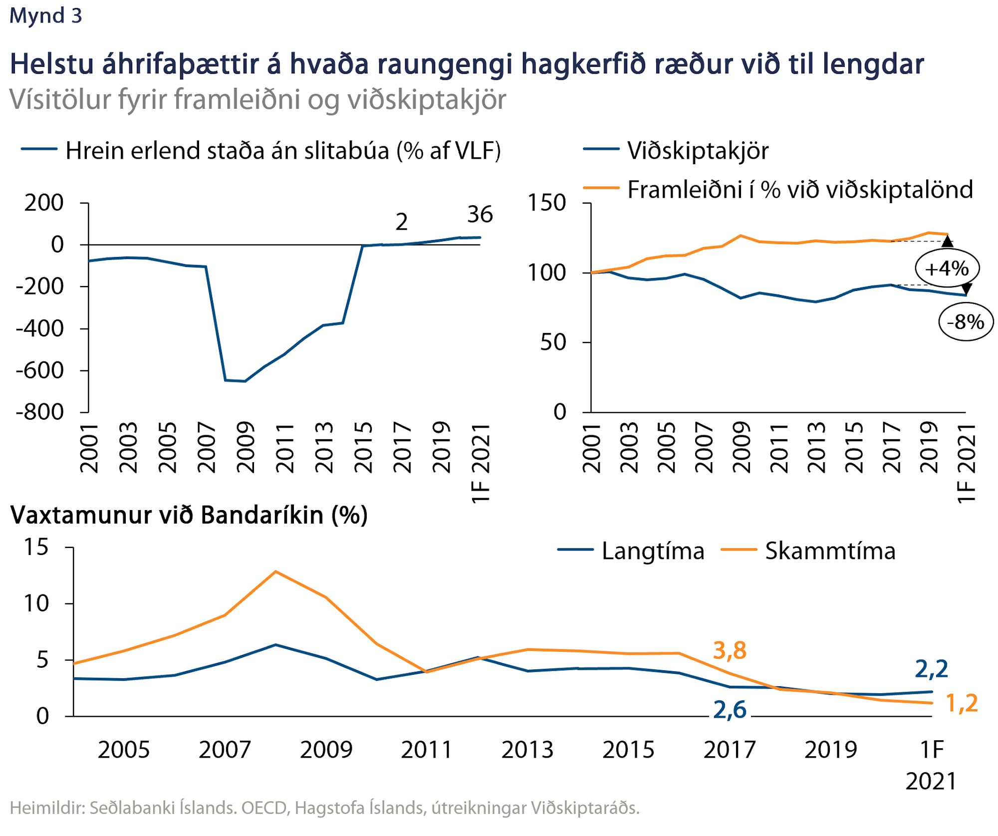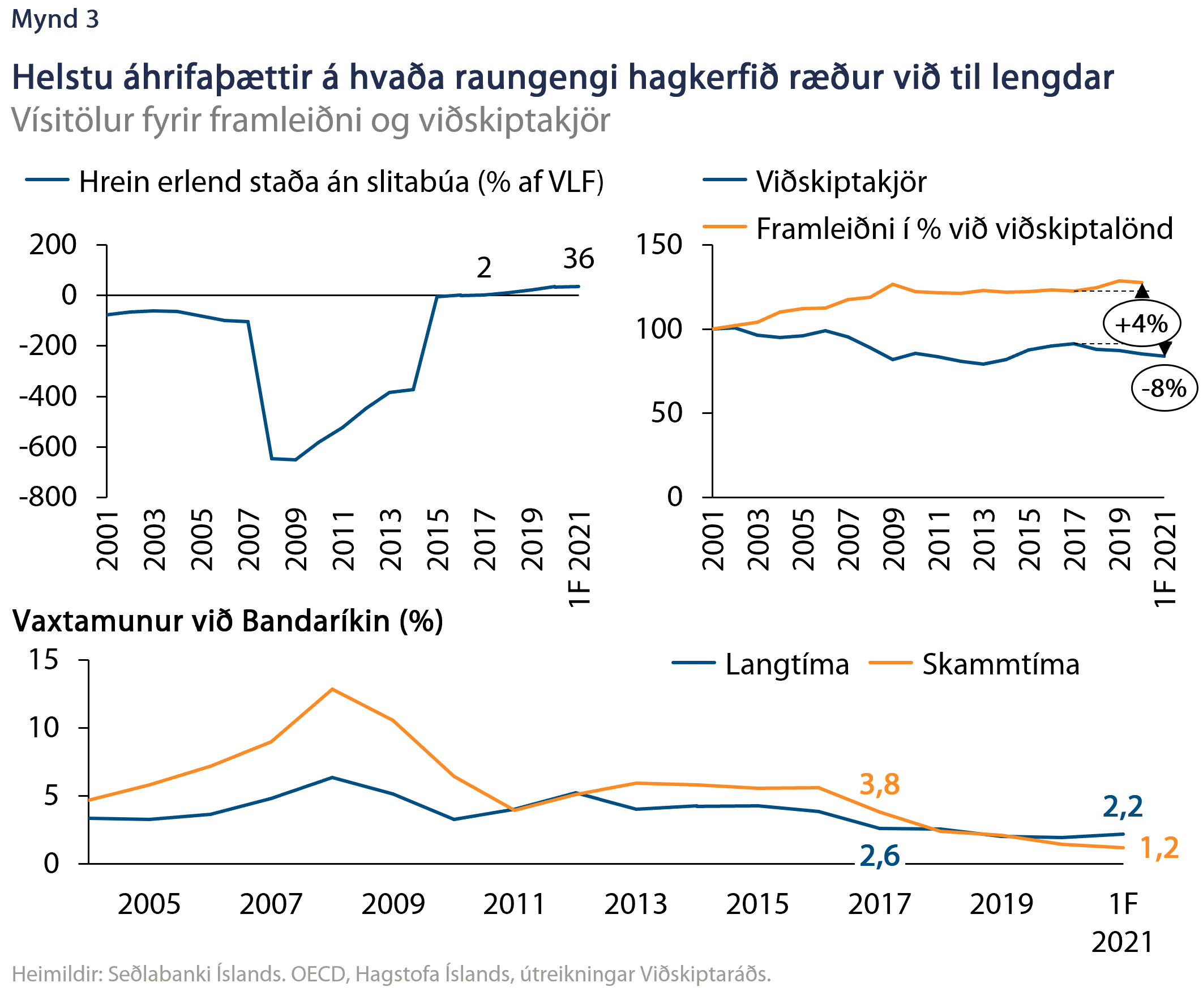 Spurningin sem eftir stendur er þó hvort hagkerfið geti staðið undir sterkari krónu en fyrir faraldurinn? Til þess þarf að skoða þá undirliggjandi þætti sem ráða því. Hægt er að nálgast það með ýmsum leiðum eins og einfaldlega að skoða hvernig helstu áhrifaþættir hafa þróast síðustu misseri (mynd 3). Skilaboðin eru misvísandi. Þróun vaxtamunar, hreinnar erlendrar stöðu, og framleiðni benda til þess að geta hagkerfisins til að standa undir sterkara gengi hafi aukist lítillega. Á móti vegur þó að viðskiptakjör eru lakari og tölfræðilegt mat byggt á eldri rannsóknum bendir til að heildaráhrifin séu fremur lítil[1]. Til viðbótar er raungengið nú rúmlega 7% yfir jafnvægisraungengi samkvæmt mati Seðlabanks, eða því gengi sem samræmist ytri stöðugleika hagkerfisins og enn er mjög óljóst hvenær ferðaþjónusta nær aftur fyrri styrk í gjaldeyristekjum.