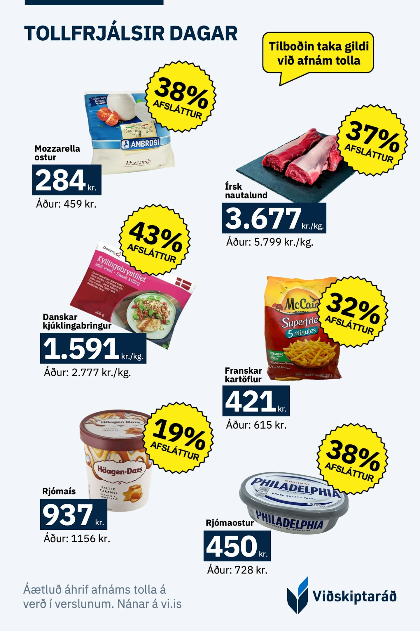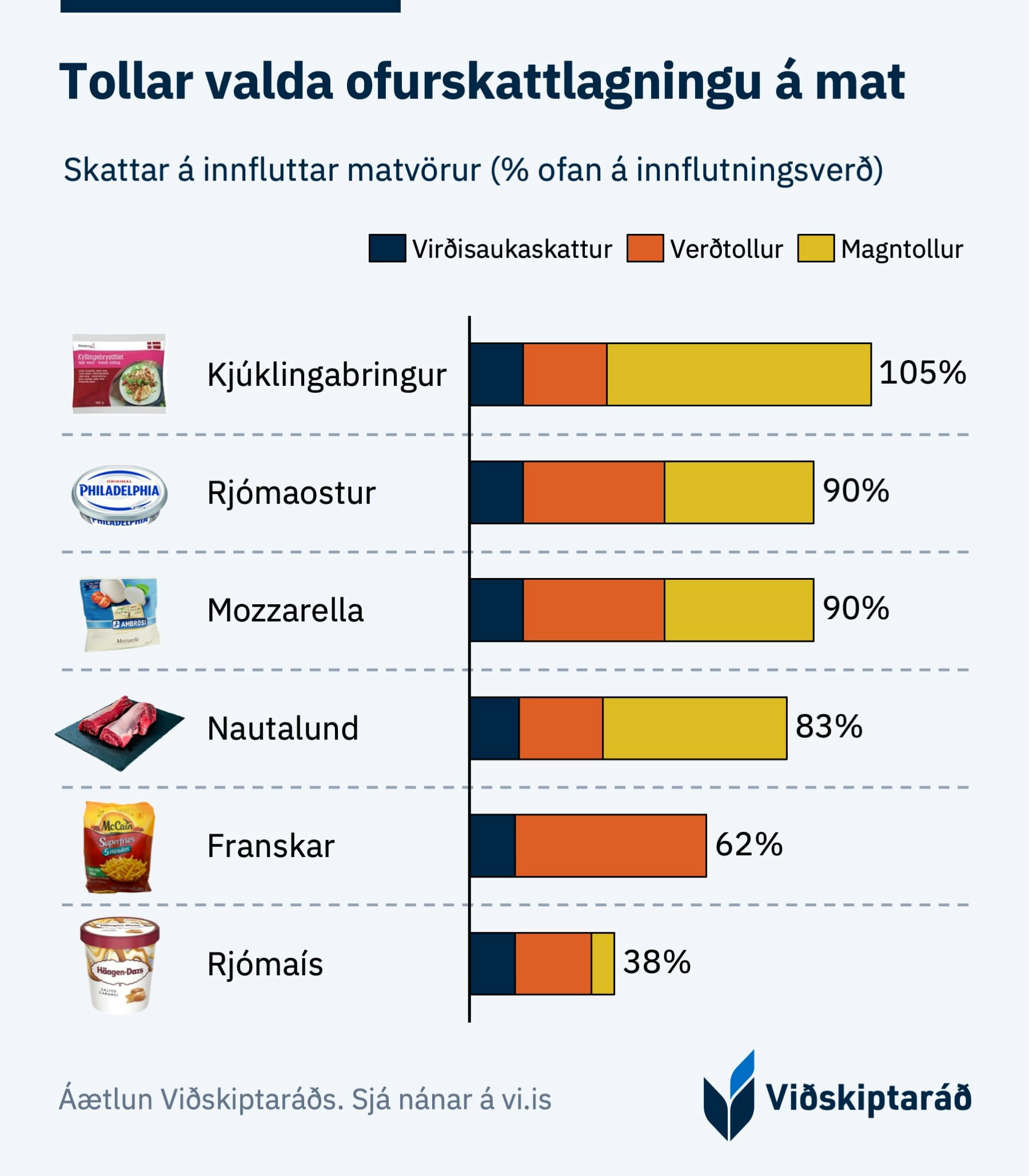 Á Íslandi eru háir tollar lagðir á innflutt matvæli. Viðskiptaráð hefur tekið saman áhrif þessara tolla á verð nokkurra vara sem eru vinsælar í innkaupakörfum íslenskra heimila. Ef tollar væru afnumdir myndi verð þeirra lækka umtalsvert: