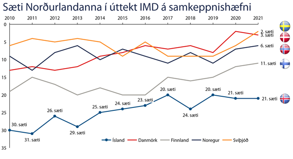 Ísland stendur í stað í 21. sæti af 64 í samkeppnishæfniúttekt IMD árið 2021, eftir að hafa lækkað um eitt sæti í fyrra. Heilt yfir má segja að Ísland hafi staðið í stað síðustu ár en árið 2017 var Ísland í 20. sæti. Áhrif heimsfaraldursins á íslenska hagkerfið hafa verið óvenju mikil miðað við önnur hátekjuríki, sem endurspeglast í niðurstöðunum. Þó má greina jákvæða þróun í mörgum undirþáttum sem og tækifæri til úrbóta. Áhyggjuefni er að Ísland hefur ekki verið jafn langt frá hinum Norðurlöndunum frá árinu 2013, en þau raða sér í þrjú af sex efstu sætunum.