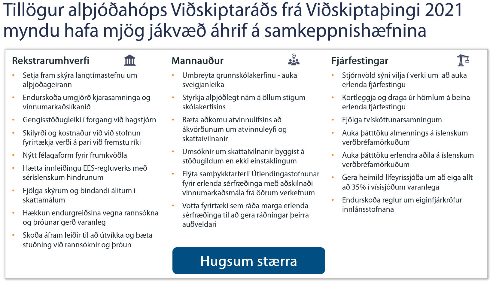 Ísland getur, ef viljinn er fyrir hendi, verið með allra samkeppnishæfustu ríkjum heims ásamt Norðurlöndunum. Til þess þarf rekstrarumhverfið í víðu samhengi að vera hagfellt íslenskum fyrirtækjum en þar eru ótal tækifæri til úrbóta. Innleiðing tillagna alþjóðahóps Viðskiptaráðs. sem fjallað var um í skýrslu Viðskiptaþings, myndu stórauka samkeppnishæfni landsins.