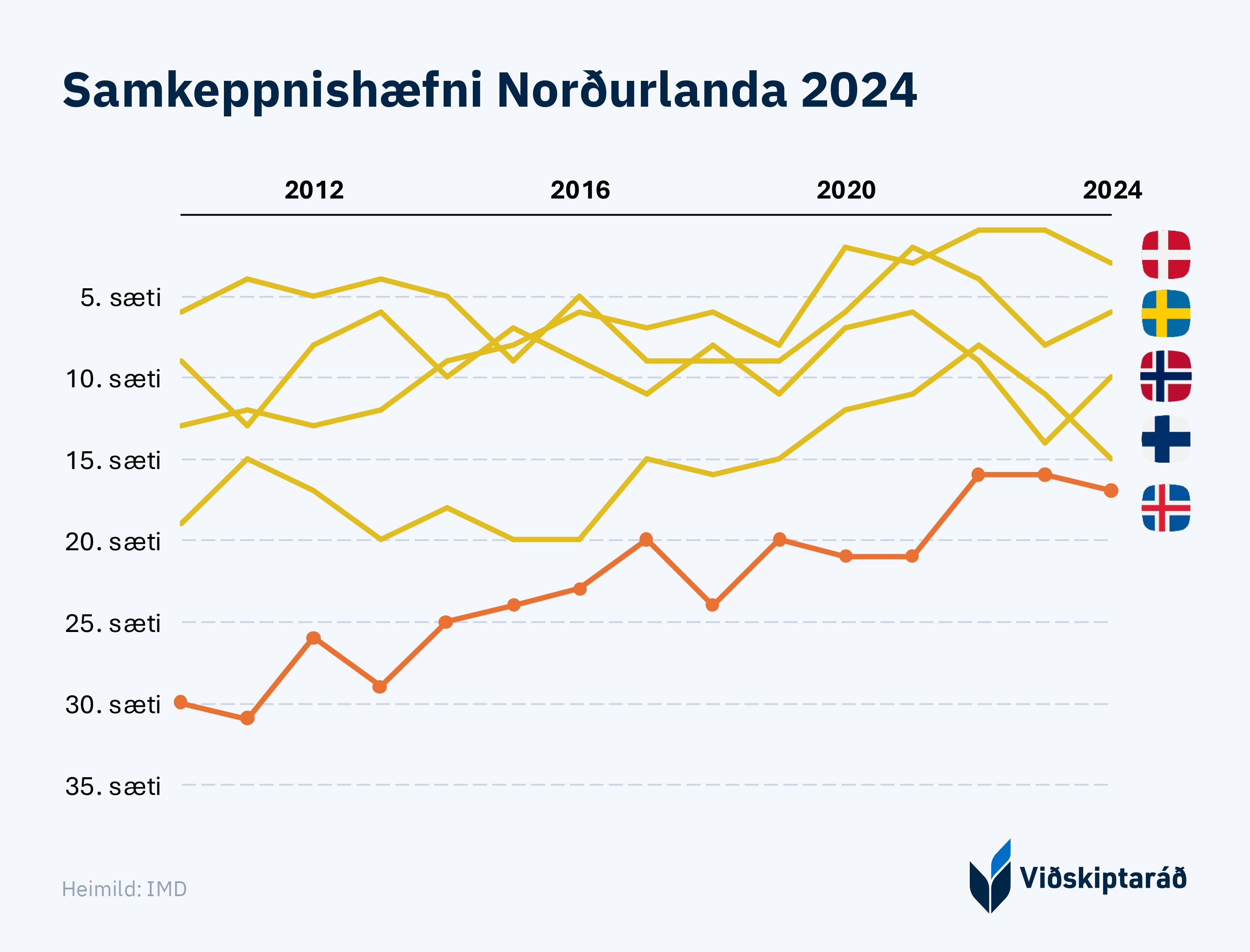 Undanfarinn áratug hefur samkeppnishæfni Íslands smám saman batnað, en fyrir tíu árum sat Ísland í 25. sæti. Litlar framfarir hafa þó orðið síðustu 2-3 ár og Ísland er ennþá eftirbátur annarra Norðurlanda í samkeppnishæfni.