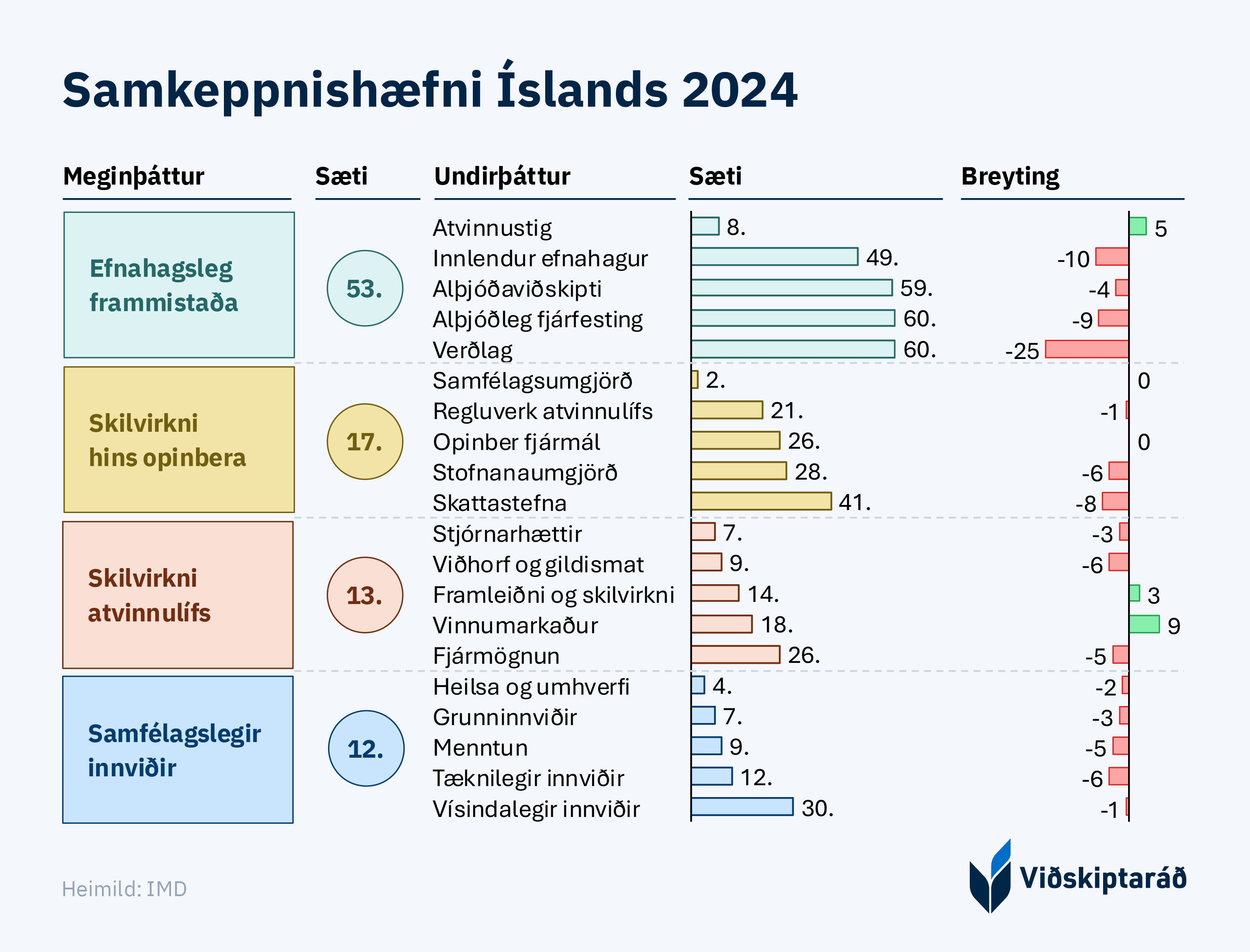 Við mat IMD á samkeppnishæfni er litið til fjögurra meginþátta og er þróun og staða Íslands nokkuð ólík á milli þessara þátta. Að þessu sinni dregur mest úr efnahagslegri frammistöðu, þar sem Ísland fellur úr 45. sæti niður í það 53., skilvirkni hins opinbera batnar lítillega á milli ára eftir að hafa fallið um fimm sæti árið á undan , og færist úr 19. sæti í 17. sæti. Skilvirkni atvinnulífsins fellur úr 10. sæti niður í 13. sæti. Samkeppnishæfni samfélagslegra innviða fellur úr 7. sæti í 12. sæti, en Ísland hafði verið á meðal tíu samkeppnishæfustu ríkja í þeim meginflokki árin 2021 – 2023.