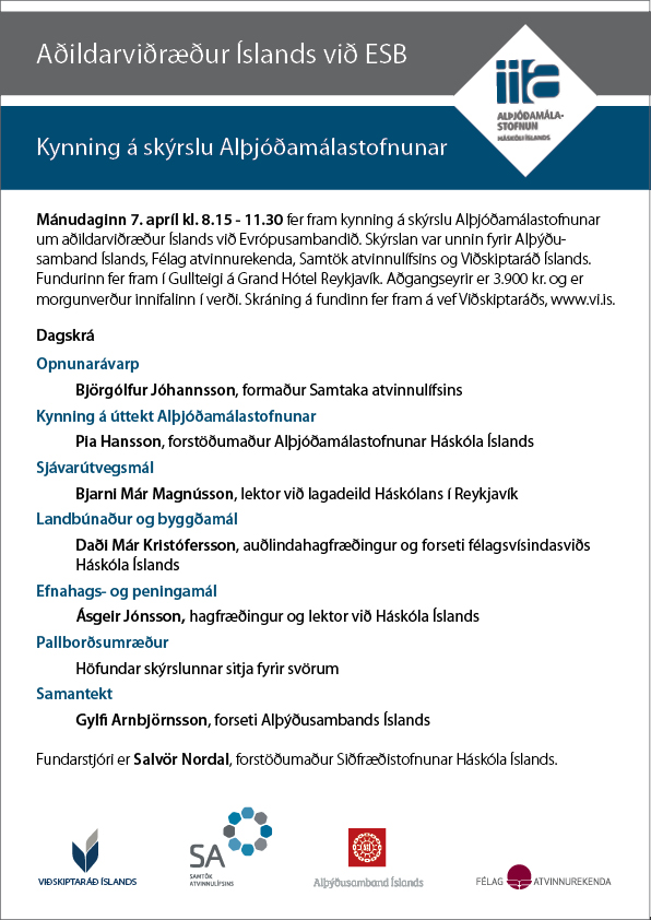 Mánudaginn 7. apríl kl. 8.15 - 11.30 fer fram kynning á skýrslu Alþjóðamálastofnunar um aðildarviðræður Íslands við Evrópusambandið. Skýrslan var unnin fyrir Alþýðusamband Íslands, Félag atvinnurekenda, Samtök atvinnulífsins og Viðskiptaráð Íslands.