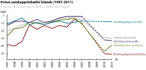 IMD viðskiptaháskólinn metur árlega samkeppnishæfi um 60 landa og hefur Ísland verið á þessum lista frá árinu 1997. Ef gengi Íslands á tímabilinu er skoðað má sjá áhugaverða þróun. Frá árinu 1997 til 2000 batnaði samkeppnishæfni landsins umtalsvert og var sú framför drifin áfram af betri …