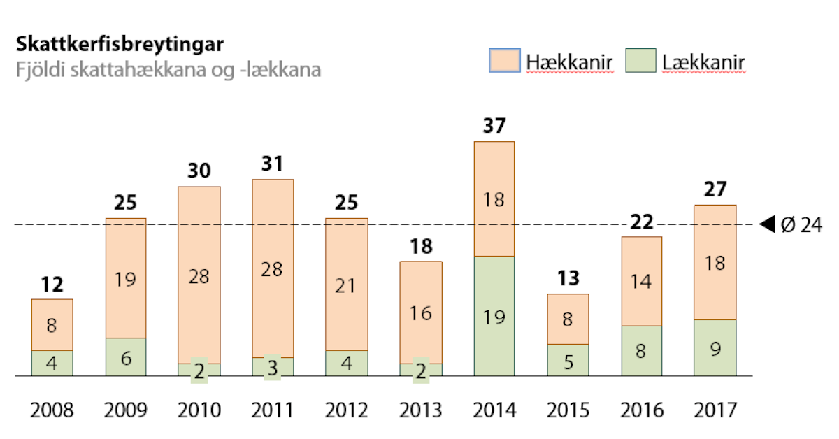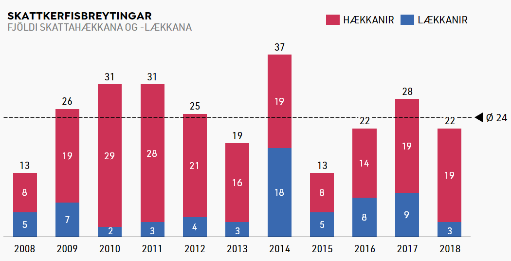 Um síðustu áramót gerðu stjórnvöld 22 breytingar á íslensku skattkerfi. 19 þeirra fólu í sér skattahækkanir en aðeins í þremur tilvikum voru skattar lækkaðir