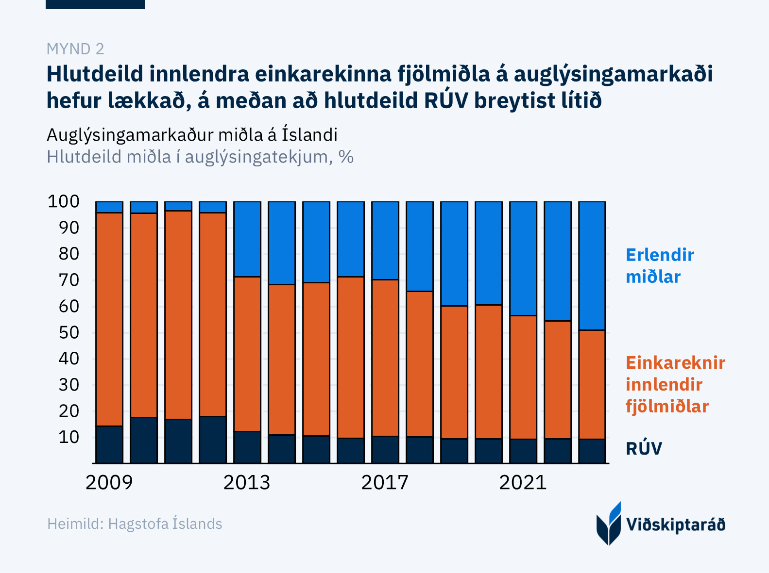 Á sama tímabili hefur hlutdeild RÚV á auglýsingamarkaði einungis lækkað um 5 prósentustig, eða úr 14% í 9%. Ríkisfjölmiðillinn hefur því gefið minna eftir til erlendra miðla en einkareknir fjölmiðlar, sem hefur leitt til þess að hlutdeild RÚV í innlendum auglýsingatekjum hefur hækkað.