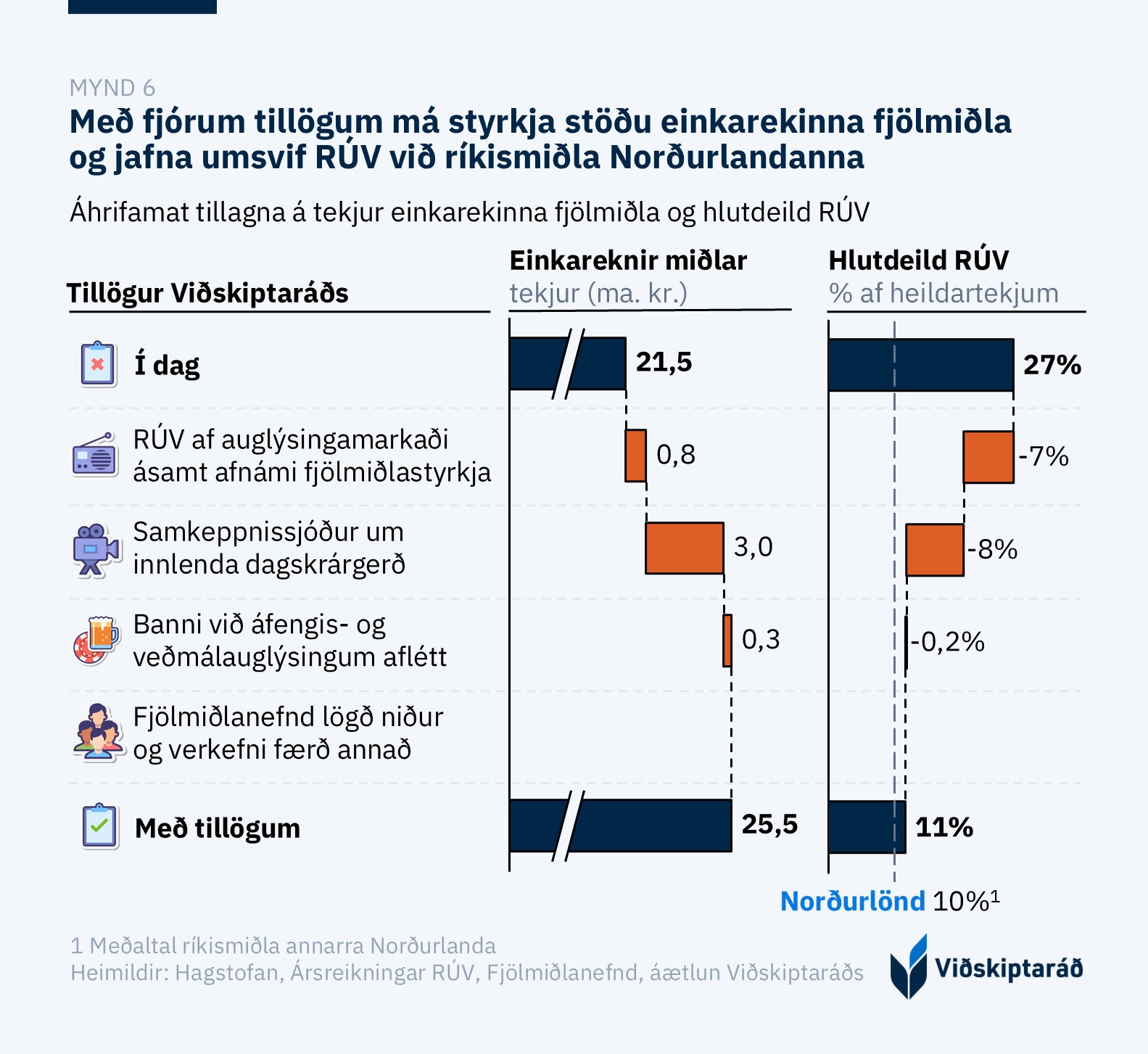 Langtímasýn Viðskiptaráðs er að ríkið stígi alfarið út af fjölmiðlamarkaði og eftirláti einkaaðilum þá starfsemi. Ráðið telur aftur á móti ekki raunhæft að það eigi sér stað á næstu misserum og hefur því útfært fjórar tillögur sem myndu færa umfang RÚV nær því sem gerist á öðrum Norðurlöndum. Tillögurnar myndu samhliða bæta rekstrarumhverfi innlendra einkarekinna fjölmiðla verulega. Þær eru eftirfarandi (mynd 6):