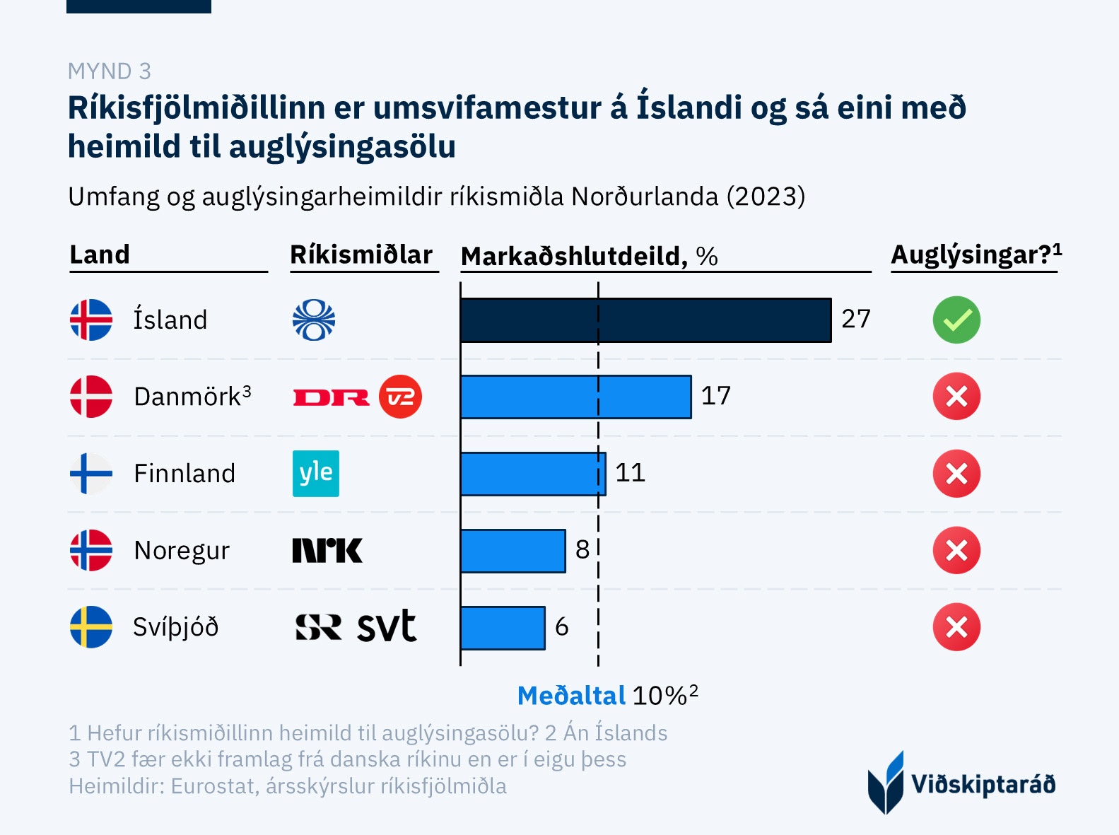 Á Íslandi eru umsvif ríkisfjölmiðilsins þau mestu á Norðurlöndum (mynd 3). Markaðshlutdeild RÚV er þannig meiri en hjá ríkismiðlum annarra Norðurlanda. Af heildartekjum fjölmiðla hefur RÚV 27% tekna á íslenskum fjölmiðlamarkaði, en hlutfallið er að jafnaði 10% á öðrum Norðurlöndum. Þá er RÚV eini norræni ríkismiðillinn sem fjármagnaður er með opinberum framlögum og er samtímis í virkri samkeppni við einkaaðila um auglýsingatekjur. [2] [3]