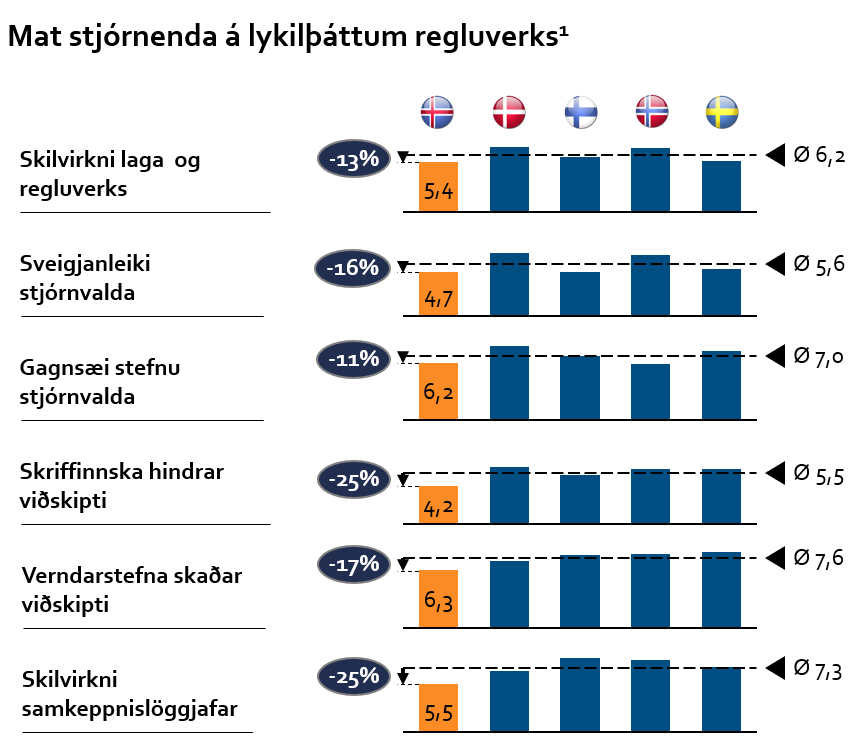 Íþyngjandi reglur sem hamla samkeppni og skapa aðgangshindranir á markaði leiða til mikils kostnaðar fyrir fyrirtæki og einstaklinga. Leggja þarf áherslu á að regluverk sé einfalt og skilvirkt og gefi ekki tilefni til túlkunar í framkvæmd sem auki enn á reglubyrði. Þá eru launatengd gjöld hátt hlutfall af launakostnaði fyrir-tækja og vinna gegn hvötum til að greiða hærri laun og fjölga störfum.
