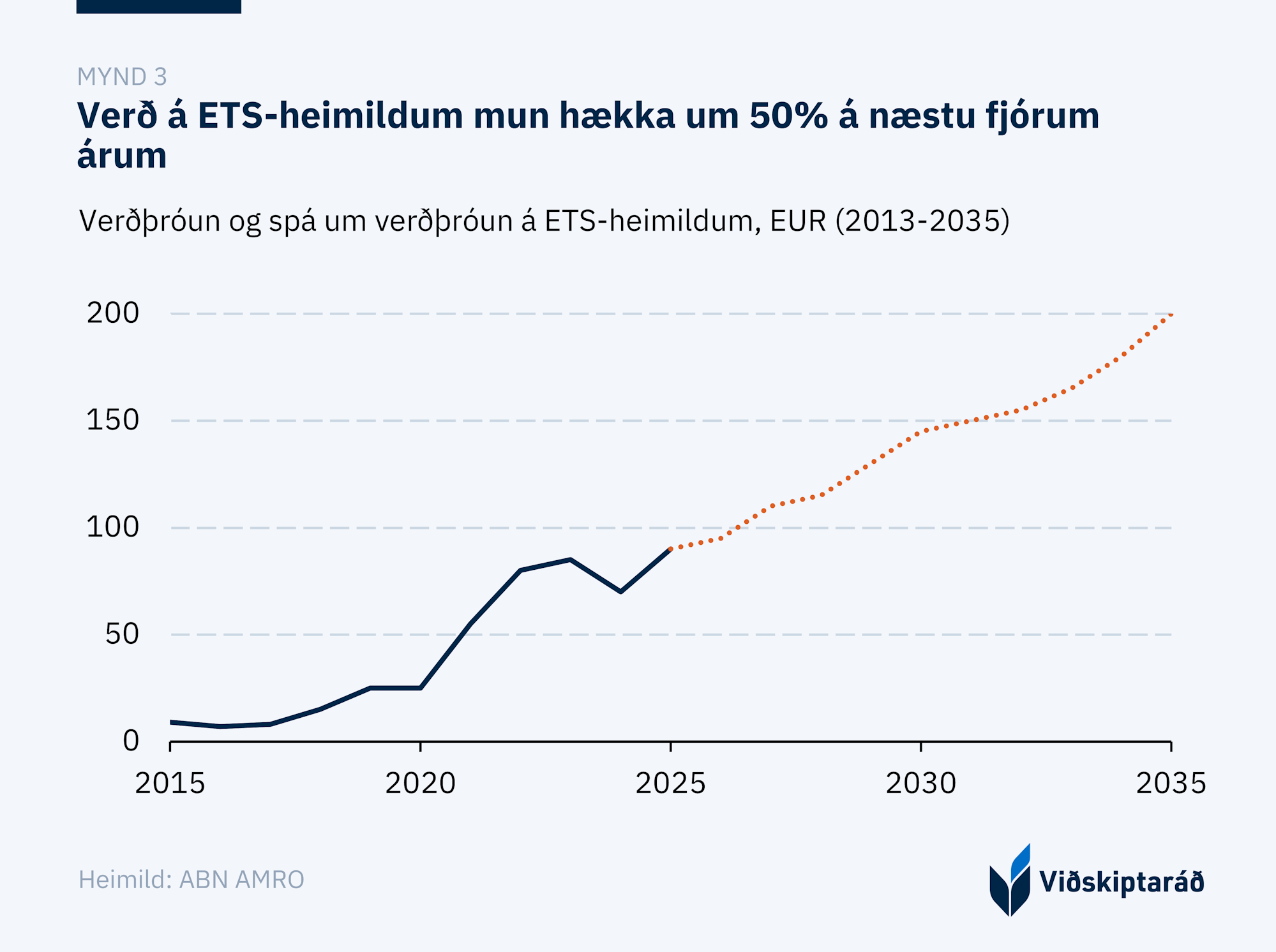 Alþjóðlegar greiningarstofnanir á borð við BloombergNEF og fjárfestingarbankar eins og ABN AMRO hafa gefið út sviðsmyndir þar sem verðið gæti verið komið upp í um 150 evrur á tonnið strax árið 2030. Ef slíkar spár ganga eftir gæti raunverulegur kostnaður íslensks atvinnulífs orðið mun meiri en núverandi áætlanir gera ráð fyrir, sem eykur enn frekar á þá óvissu sem íslensk fyrirtæki standa frammi fyrir (mynd 3).[9]