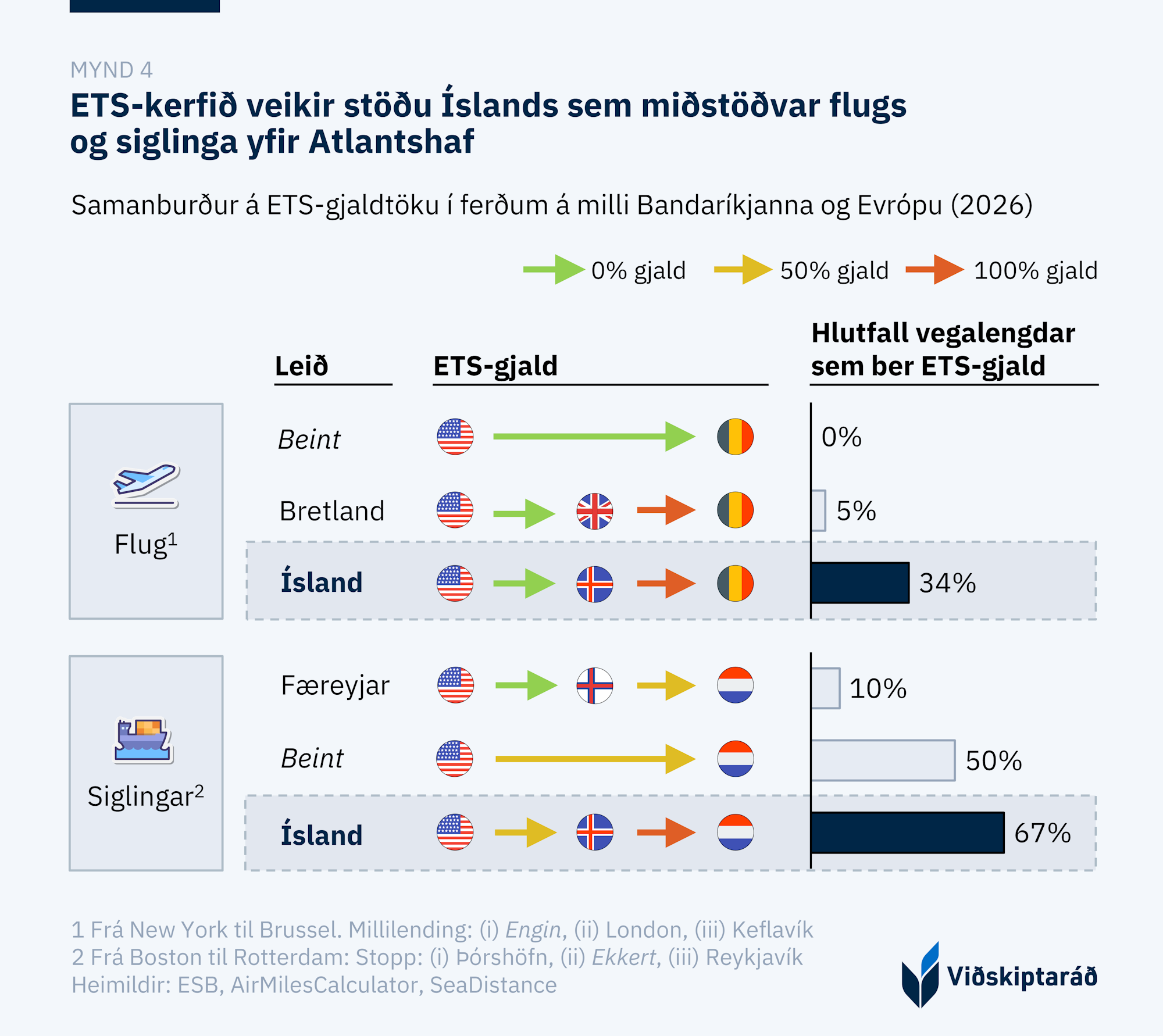 Sem dæmi um hvernig hönnun kerfisins bitnar á samkeppnisstöðu Íslands, má skoða dæmi um þrjár mismunandi siglingaleiðir milli Boston og Rotterdam (mynd 4). Ef siglt er beint frá Boston til Rotterdam þurfa skipafélög að kaupa losunarheimildir fyrir 50% af leiðinni. Hafi skip viðkomu á Íslandi fellur 67% af leiðinni innan ETS-kerfisins. Velji skipafélög aftur á móti að stoppa frekar í Færeyjum á leiðinni frá Boston til Rotterdam fellur aðeins 10% af leiðinni innan ETS-kerfisins, þar sem að Færeyjar standa utan ETS-kerfisins og því þurfa skipafélög ekki að kaupa neinar losunarheimildir fyrir leiðina frá Bandaríkjunum til Færeyja. Kerfið dregur þannig úr samkeppnishæfni Íslands í vöruflutningum, sérstaklega þegar litið er til okkar næstu nágranna í Færeyjum og á Grænlandi, sem hvort tveggja standa utan ETS-kerfisins.[17]