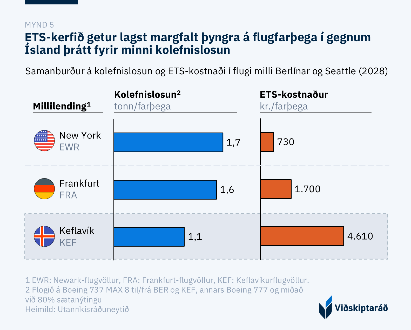 Til að varpa ljósi á hvernig kerfið bitnar á samkeppnisstöðu Íslands má skoða dæmi um þrjár mismunandi flugferðir milli New York og Brussel. Í beinu flugi þurfa flugfélög ekki að kaupa neinar losunarheimildir fyrir fluglegginn. Sé millilent í London þurfa flugfélög að kaupa losunarheimildir fyrir losun sem fellur til á seinni flugleggnum og þá fellur 5% af leiðinni innan ETS-kerfisins. Ef millilent er í Keflavík þurfa flugfélög að kaupa losunarheimildir fyrir fluglegginn frá Keflavík til Brussel og þar með fellur 34% leiðarinnar innan ETS-kerfisins.[13]