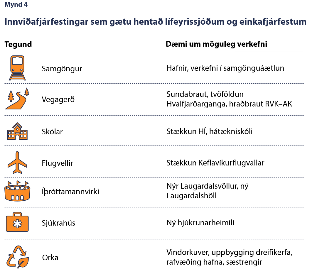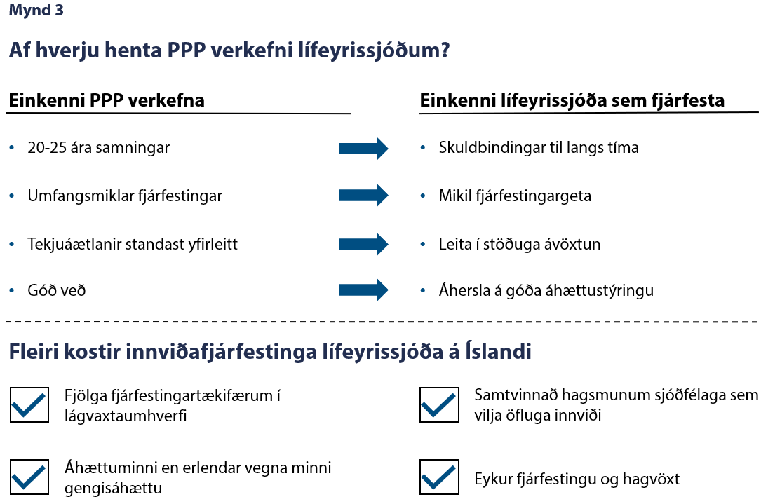 Ýmis sjónarmið, til viðbótar við framangreind, benda til þess að íslenskir lífeyrissjóðir gætu hagnast á innviðaverkefnum (mynd 3). Þrátt fyrir það hefur þeim, að sögn forsvarsmanna nokkurra sjóða, ekki gefist kostur á að koma að fjármögnun PPP-verkefna hér á landi síðustu ár. Sjóðirnir hafa í staðinn leitað til útlanda og fjárfest í erlendum innviðasjóðum. Leiða má líkur að því að ástæðan fyrir tregðu til PPP-verkefna sé m.a. sú að stjórnvöld telji of áhættusamt að lífeyrir landsmanna sé notaður til slíkra fjárfestinga. Í því samhengi má benda á að hagsmunir almennings eru sambærilegir hvort sem innviðafjárfestingar eru fjármagnaðar af lífeyrissjóðum eða hinu opinbera. Ef verkefni fjármögnuð af hinu opinbera fara fram úr kostnaðaráætlun kemur það fyrr eða síðar niður á almenningi, annað hvort með aukinni skattbyrði eða skerðingu á opinberri þjónustu, nema hvort tveggja sé. Á sama hátt gætu lífeyrissjóðir fjárfest í verkefnum sem ekki skila tilætlaðri ávöxtun, en markmiðið með dreifðu eignasafni og ígrunduðu mati á fjárfestingarkostum er einmitt að lágmarka tap sjóðfélaga ef svo færi.