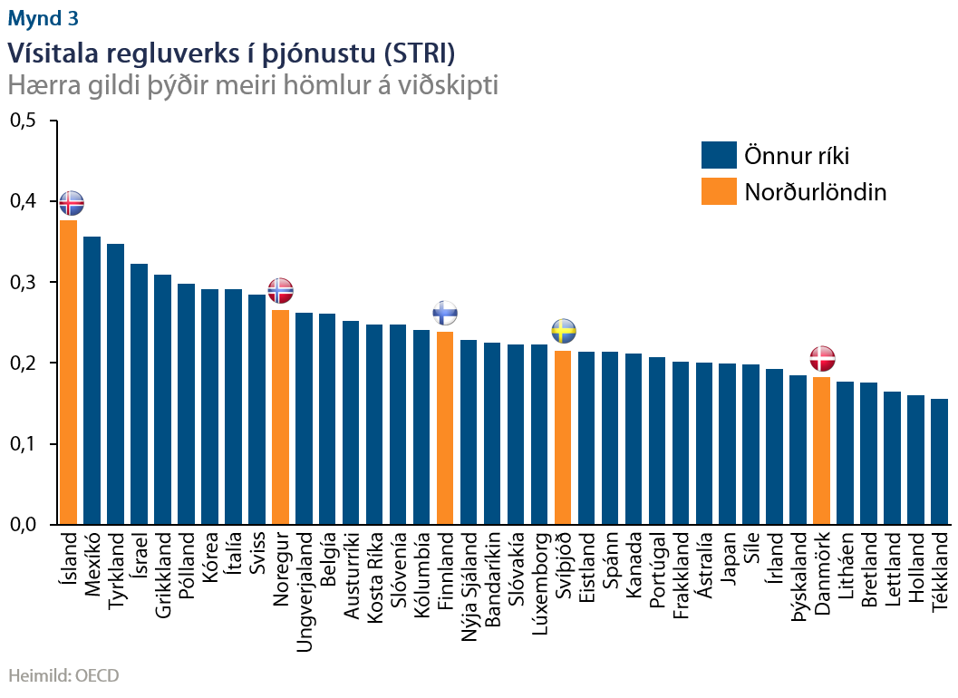 OECD framkvæmir reglulega kannanir á hversu íþyngjandi regluverk er í hinum ýmsu þjónustuviðskiptum, en sú könnun leiðir af sér vísitölu regluverks í þjónustugreinum (e. Services Trade Restrictiveness Index). Ísland á þann vafasama heiður að verma neðsta sæti listans meðal OECD ríkja, en Indónesía, Indland og Tæland koma í sætunum þar á eftir. Nauðsynlegt er að bæta úr þessari stöðu þar sem mikið er í húfi fyrir landsmenn þegar kemur að hömlum á viðskipti. Að mati OECD gætu aðgerðir sem auka skilvirkni regluverks um helming skilað sér í 15% lægri viðskiptakostnaði í þjónustu yfir landamæri innan fárra ára. Vegna þess hve miklar þessar hömlur vegna regluverks eru hérlendis gæti kostnaðurinn lækkað um 28%.
