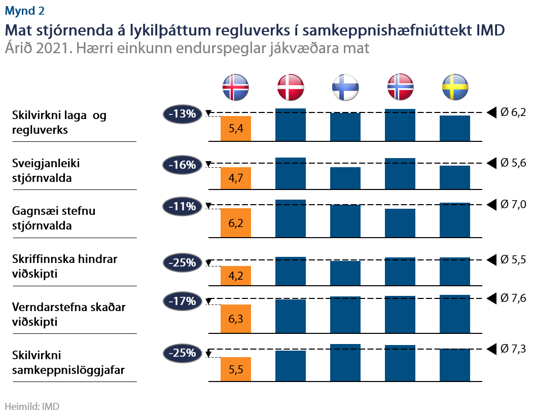 Ef skoðað er hvað einkennir þau ríki sem hækka hvað mest á listanum milli ára, eru það ekki endilega aðgerðir sem miða að því að lágmarka umfang regluverksins, heldur hámarka skilvirkni þess með því að skapa umgjörð sem hindrar ekki þróun einkageirans og þann lífsgæðaauka sem fylgir að jafnaði í kjölfarið. Í sömu úttekt er mat stjórnenda á þeim þáttum sem eru sérstaklega aðlaðandi varðandi hagkerfið kannaðir og þar kemur Ísland iðulega verr út en Norðurlöndin í þáttum sem varða regluverk. Það gefur enn skýrari vísbendingu um að regluverk á Íslandi sé meira íþyngjandi en í grannríkjum okkar (mynd 2).
