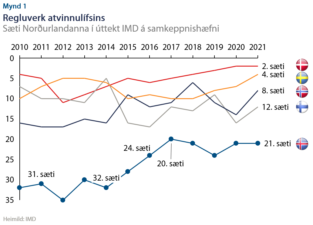 Sé staða okkar skoðuð í alþjóðlegu samhengi eru vísbendingar um að íslenskt regluverk sé óskilvirkt. Niðurstöður úttektar IMD háskólans á samkeppnishæfni ríkja sýna að Ísland er eftirbátur Norðurlandanna þegar kemur að því að skapa regluumgjörð sem tryggir hagfellt viðskiptaumhverfi. Á kjörtímabili síðustu ríkisstjórnar hefur staða Íslands lítið breyst og Ísland fallið um eitt sæti á listanum. Lítið bendir því til að regluverk viðskiptaumhverfis á Íslandi sé að skána þrátt fyrir fyrirheit síðustu ríkisstjórnar. Við stöndum þannig í stað á meðan Svíþjóð og Danmörk, lönd sem við berum okkur oft saman við, hafa hækkað upp í 2. og 4. sæti listans.