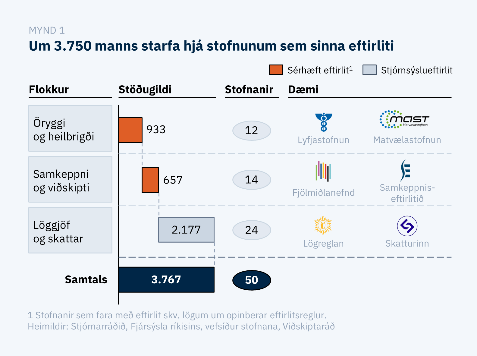 Á Íslandi starfa um 3.750 manns hjá 50 opinberum stofnunum sem sinna eftirliti. Tæplega 2.200 manns starfa við eftirlit á borð við löggæslu, tollgæslu og eftirfylgni með greiðslu skatta og gjalda, en sú tegund eftirlits nefnist stjórnsýslueftirlit. Þá starfa um 1.600 manns við svokallað sérhæft eftirlit. Starfsfólk þeirra stofnana framfylgir afmörkuðum eftirlitsreglum sem beinast að fyrirtækjum og einstaklingum.