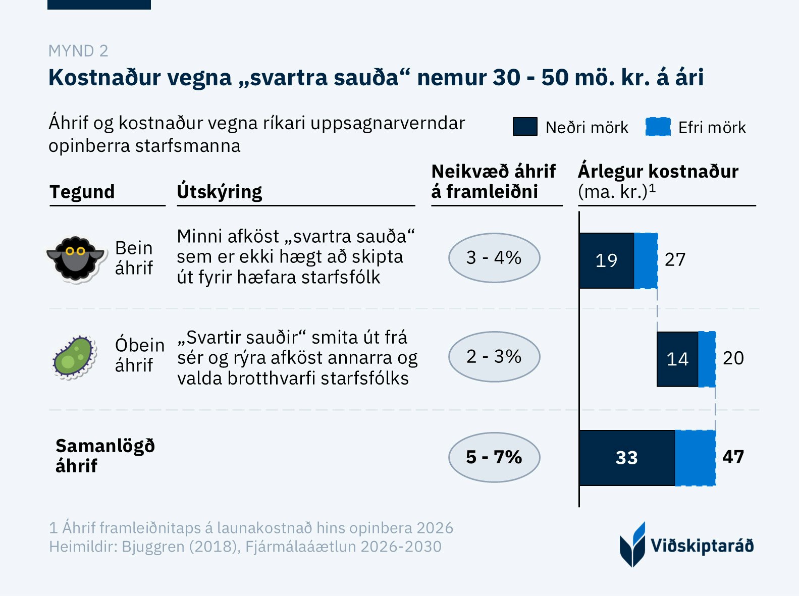 Viðskiptaráð áætlar að ríkari uppsagnarvernd opinberra starfsmanna kosti ríki og sveitarfélög 30 til 50 ma. kr. á ári (mynd 2). Með því að staðfæra framangreindar rannsóknir á Ísland er mat ráðsins að neikvæð áhrif „svartra sauða“ á framleiðni hjá hinu opinbera séu 5-7%. Kostnaðarmatið fæst með því að margfalda þau áhrif með launakostnaði hins opinbera, sem nemur 688 ma. kr. árið 2025. Þetta er hóflegt mat þar sem neikvæð áhrif á aðra útgjaldaliði en laun eru ekki meðtalin.