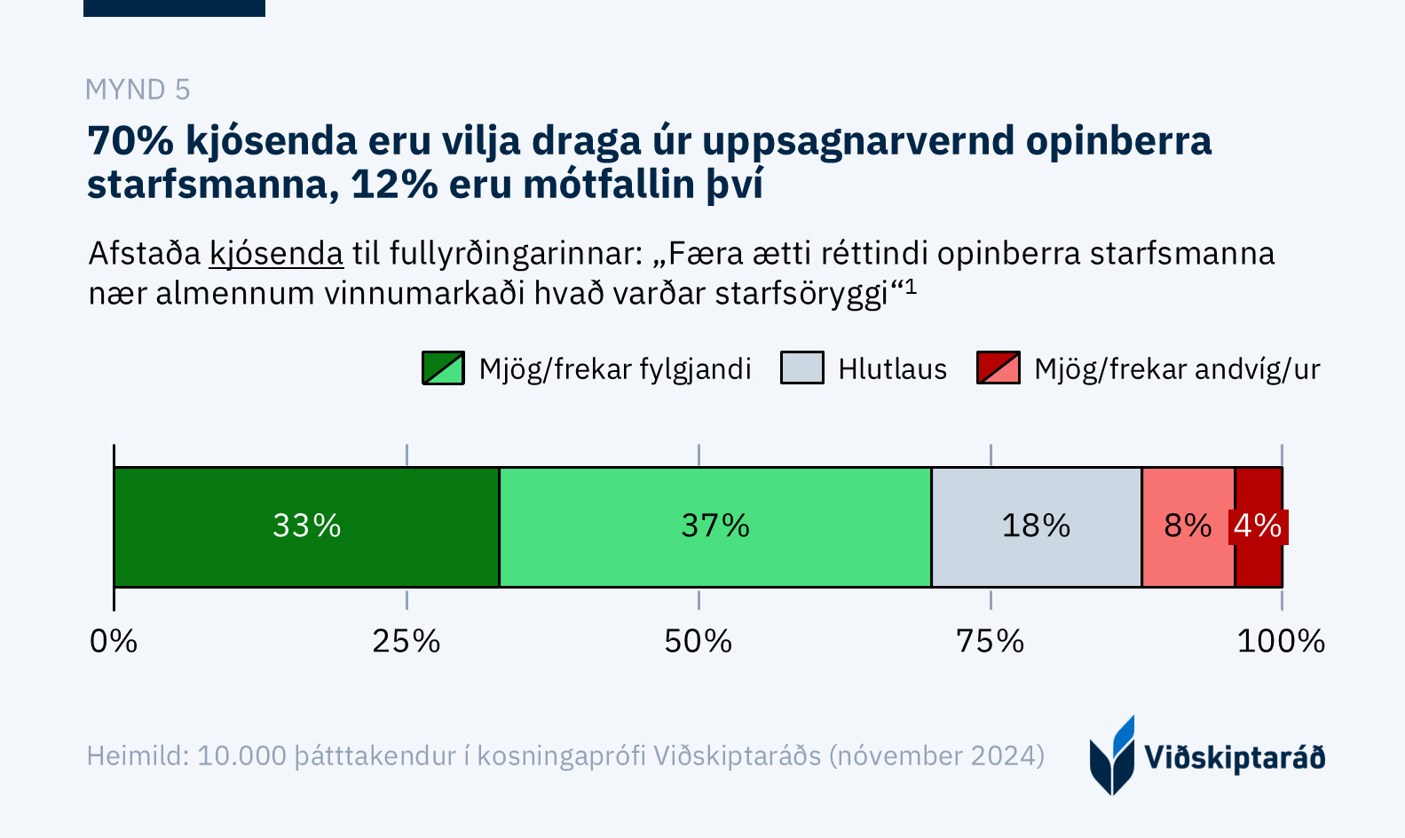 Almenningur telur einnig að færa eigi uppsagnarvernd opinberra starfsmanna nær almennum vinnumarkaði (mynd 5). Niðurstöður þátttakenda í kosningaprófi sem Viðskiptaráð lagði fyrir almenning í aðdraganda Alþingiskosninga 2024 sýndu að 70% almennings eru fylgjandi því að færa réttindi opinberra starfsmanna nær því sem tíðkast á almennum vinnumarkaði. Aðeins 12% lýstu sig andvíg tillögunni og því ljóst að mikill stuðningur er við að jafna stöðu milli markaða meðal almennings. [13]