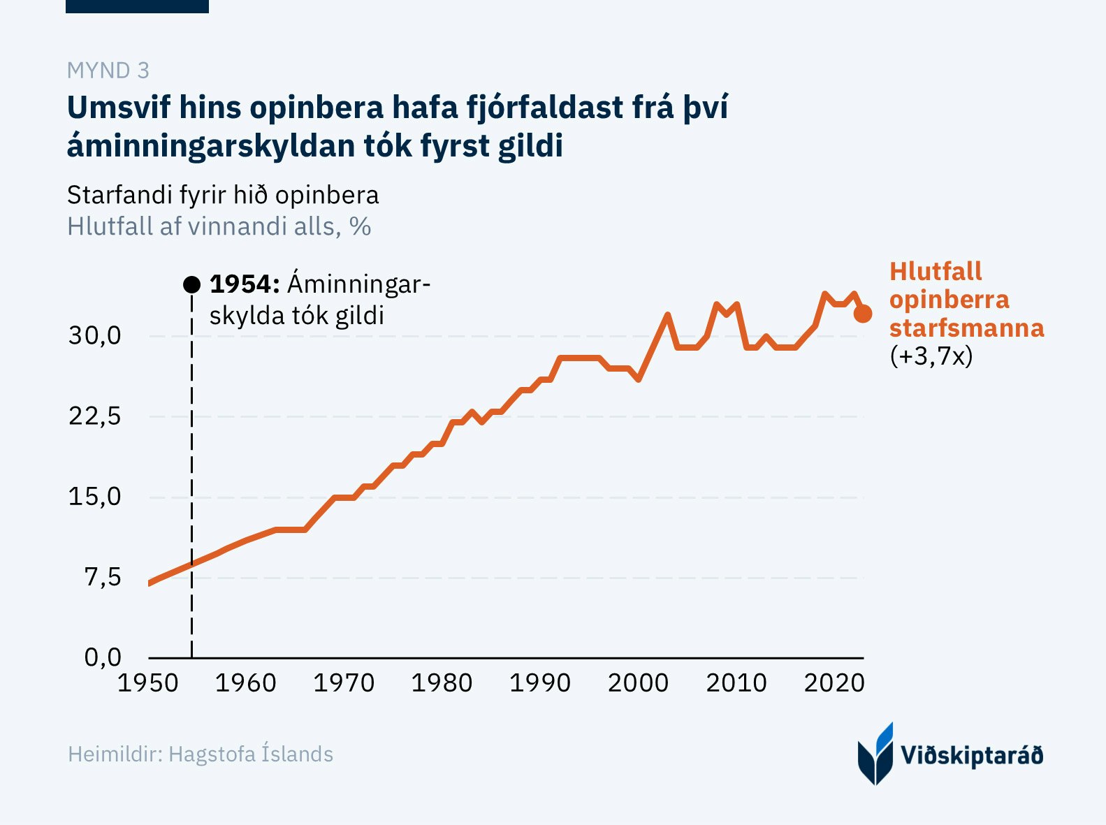 Frá því áminningarskyldan tók fyrst gildi árið 1954 hefur hlutfall starfandi hjá hinu opinbera af vinnumarkaðnum þrefaldast (mynd 3). Árið 1965 starfaði einn af hverjum tíu hjá hinu opinbera. Í dag er hlutfallið einn af hverjum þremur. Munurinn skýrist af vaxandi umfangi hins opinbera í íslensku samfélagi, sérstaklega í heilbrigðis- og menntakerfinu.