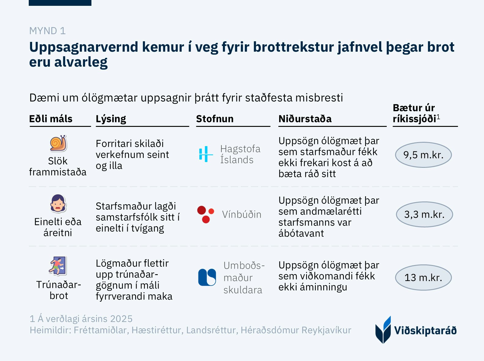 Mörg dæmi eru um að misbrestir starfsmanna séu staðfestir af dómstólum en strangar reglur um starfslok leiða engu að síður til skaðabótaskyldu hins opinbera eða koma í veg fyrir uppsögn yfir höfuð (mynd 1). Þessi dæmi skiptast í þrjá flokka: (1) Slaka frammistöðu, (2) einelti, ofbeldi eða áreitni, og (3) trúnaðarbrot í starfi. Hér má sjá eitt dæmi úr hverjum flokki samkvæmt dómstólum: