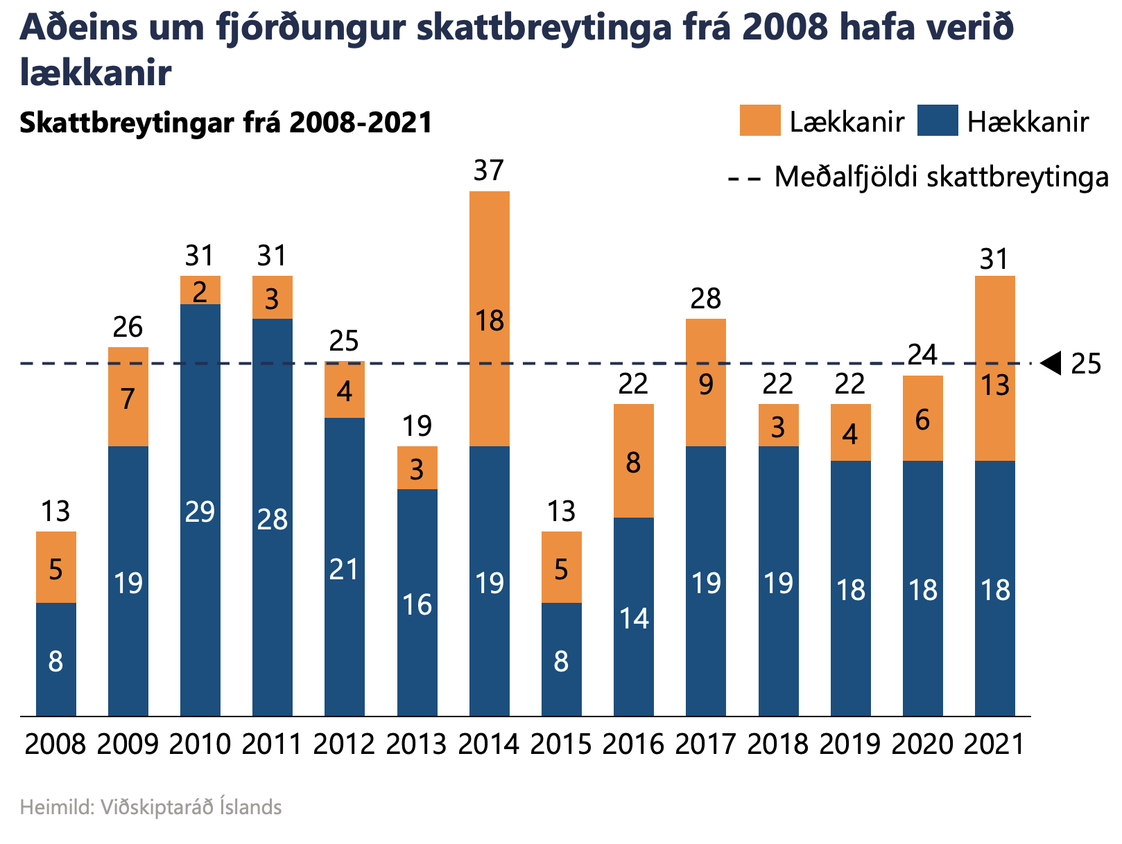Sé litið aftur til ársins 2008 hefur aðeins um fjórðungur skattbreytinga verið til lækkunar á sköttum; 90 af 344. Þannig hafa 246 breytingar verið til hækkunar á sköttum og niðurstaðan er: Þrjár skattahækkanir fyrir hverja lækkun.