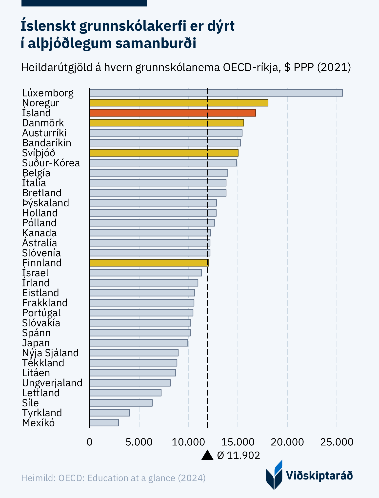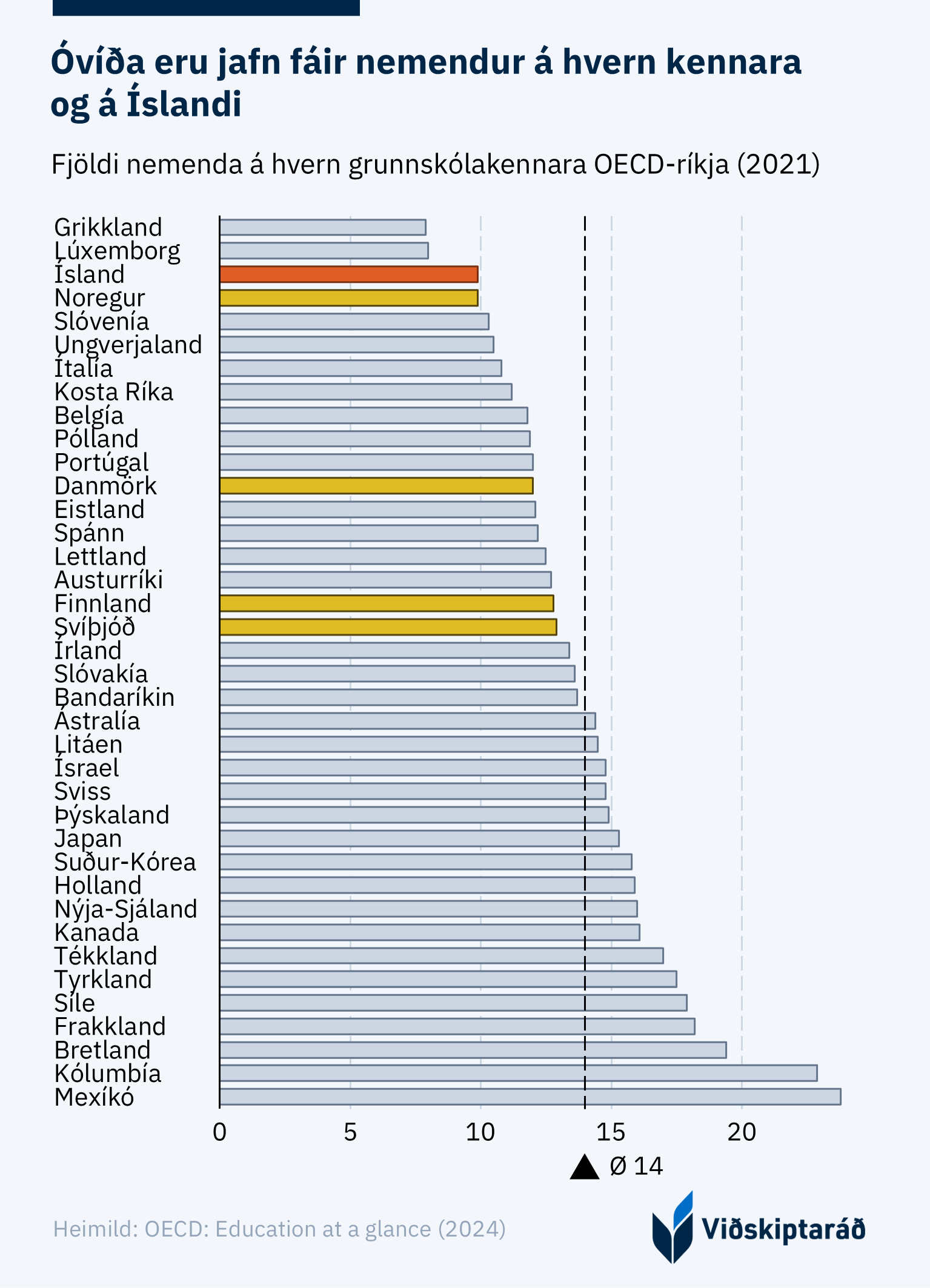 Grunnskólakennurum hefur fjölgað hraðar en nemendum undanfarin ár. Þá er kennsluskylda lítil, veikindi algeng, kennarar margir og kostnaður hár samanborið við önnur ríki. Þetta er niðurstaða nýrrar samantektar Viðskiptaráðs á hagkvæmni íslenskra grunnskóla í alþjóðlegu samhengi.