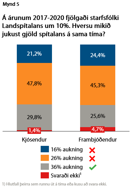 Athygli vekur að tæplega 26% frambjóðenda eru með á hreinu hversu mikið útgjöld Landspítalans jukust á áraunum 2017-2020, en á því tímabili fjölgaði starfsfólki um 10%. Nær helmingur kjósenda og frambjóðenda töldu gjöld spítalans hafa aukist um 26% á tímabilinu. Hið rétta er að útgjöld spítalans jukust talsvert meira, eða um 36%.