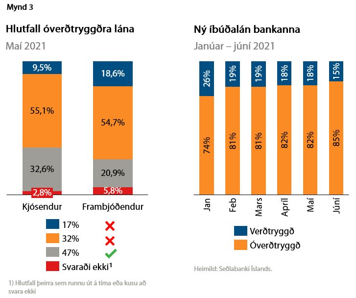 Sú spurning sem fæstir frambjóðendur svöruðu rétt snýr að skiptingu íbúðalána. Tekið er fram að í ársbyrjun 2016 voru 16% lána heimilanna óverðtryggð og spurt var: Hvert var hlutfallið í maí 2021? Rétt svar er 47% en aðeins fimmti hver frambjóðandi svaraði rétt og þriðji hver kjósandi. Hins vegar taldi rúmlega helmingur kjósenda og frambjóðenda hlutfallið vera 32%. Hlutfall óverðtryggðra íbúðalána hefur farið ört vaxandi síðustu ár en hrein ný óverðtryggð íbúðalán námu 25,3 ma.kr. í ágúst og verðtryggð lán voru greidd upp fyrir 4,3 ma.kr.