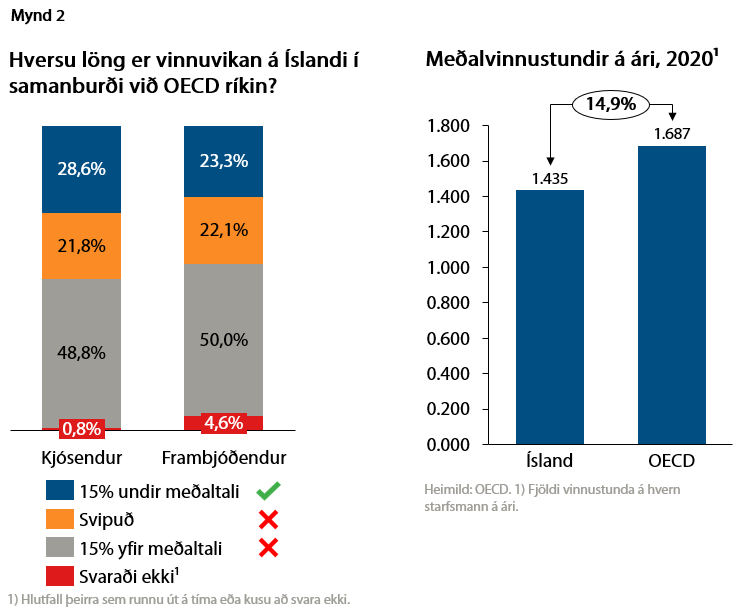Þessi misskilningur á m.a. rætur sínar að rekja til ósamræmis í mælingum vinnustunda hér áður fyrr samanborið við annars staðar. Fram til ársins 2018 var fjöldi unninna vinnustunda í vinnumarkaðsannsókn Hagstofunnar ofmetinn þar sem svörin byggðu alfarið á upplifun svarenda og var matartími til dæmis talinn til vinnutíma. Hagstofan birti því nýtt mat á vinnustundum árið 2018 en af því er ljóst að Ísland er raunar í flokki þeirra ríkja sem vinnur fæstar vinnustundir og er á pari við Norðurlöndin.
