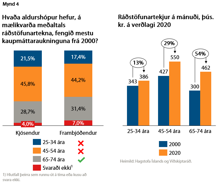 Sú spurning sem fæstir kjósendur svöruðu rétt snýr að kaupmáttaraukningu þjóðarinnar eftir aldurshópum. Spurt var: Hvaða aldurshópur hefur, á mælikvarða meðaltals ráðstöfunartekna, fengið mestu kaupmáttaraukninguna frá árinu 2000? Að meðaltali hafa ráðstöfunartekjur fólks á bilinu 65-74 ára aukist mest frá árinu 2000 eða um 54% á verðlagi ársins 2020. Þó var algengast að bæði kjósendur og frambjóðendur teldu aukninguna mesta hjá fólki á miðjum aldri en kaupmáttaraukning þess hóps nemur aðeins 29% frá árinu 2000.