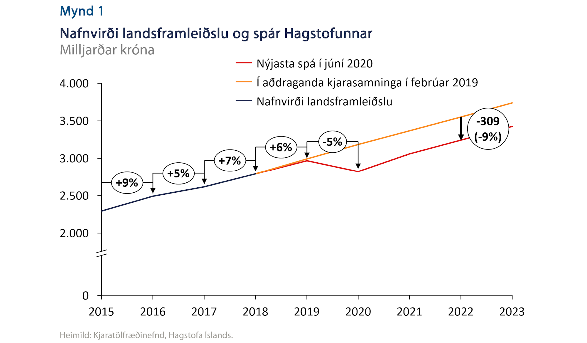 Lífskjarasamningurinn í apríl 2019, auk þeirra samninga sem á eftir hafa komið, byggja á forsendum um samfellt hagvaxtarskeið sem átti að standa undir ríkulegum launahækkunum. Enginn sá kórónuveiruna fyrir en ljóst er að þær forsendur munu ekki standast. Horfur eru á því að við lok lífskjarasamningsins verði landsframleiðsla 9% lægri en það sem laun lífskjarasamningsins byggðu á (mynd 1). Þýðir það að verðmætin sem eru til skiptanna til að greiða fyrir þessar launahækkanir verða 309 millljörðum króna minni en gert var ráð fyrir. Fyrirtækjum hefur því verið sniðinn afar þröngur stakkur til að standa undir launahækkunum.