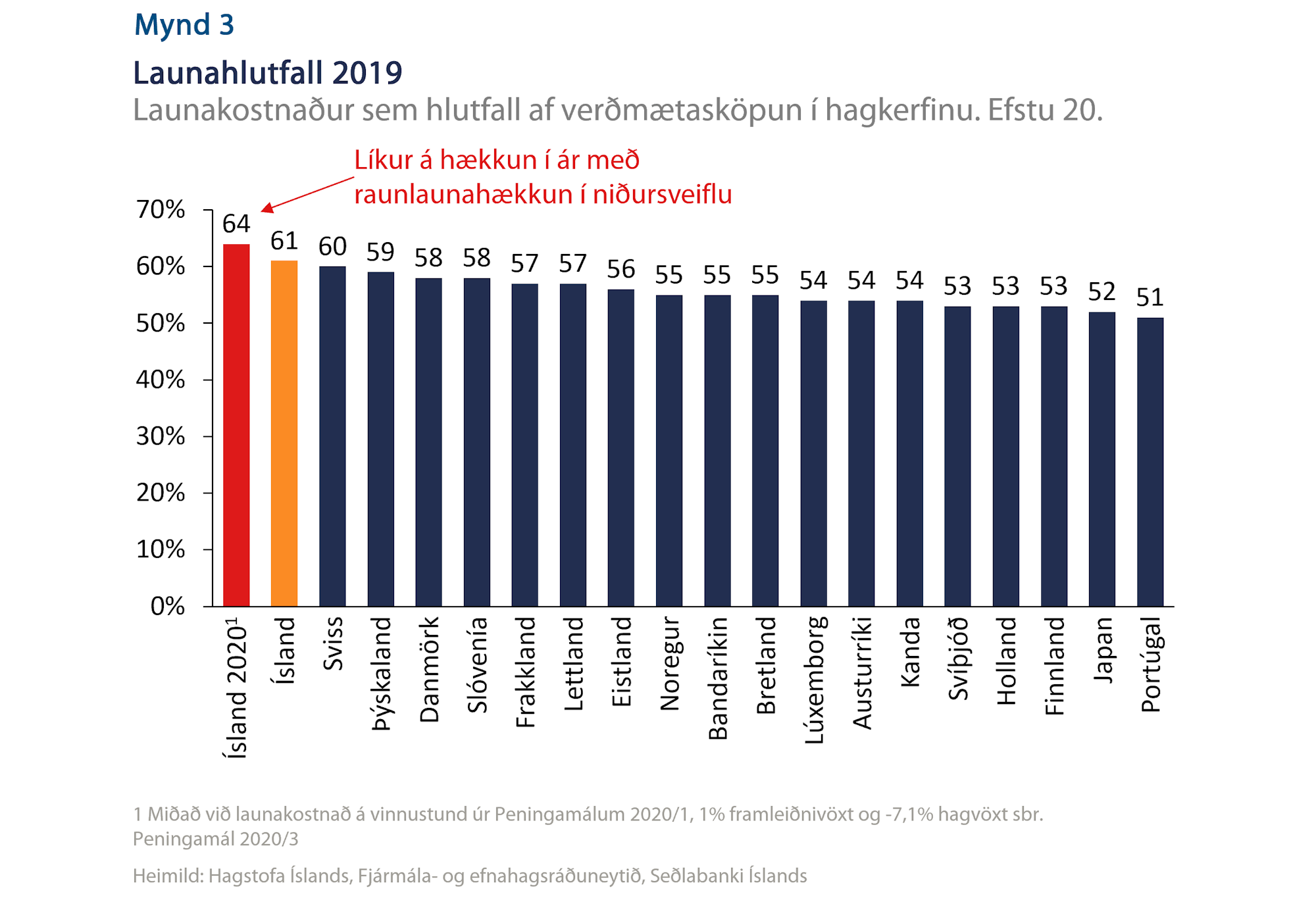 Í alþjóðlegum samanburði fengu launþegar hvergi stærri hlut af verðmætasköpun hagkerfisins en hér á landi árið 2019. Gefur það til kynna að svigrúm til launahækkana hafi þegar verið nýtt til hins ýtrasta. Vegna samdráttar í hagkerfinu og verulegum raunlaunahækkunum eru í ofanálag líkur á að þetta hlutfall skeri sig enn meira úr því sem gengur og gerist annars staðar (mynd 4). Ljóst er því að nú, þegar minna er til skiptanna, muni umræddar launahækkanir verða mörgum fyrirtækjum of þung byrði sem eykur líkur á uppsögnum og gjaldþrotum.