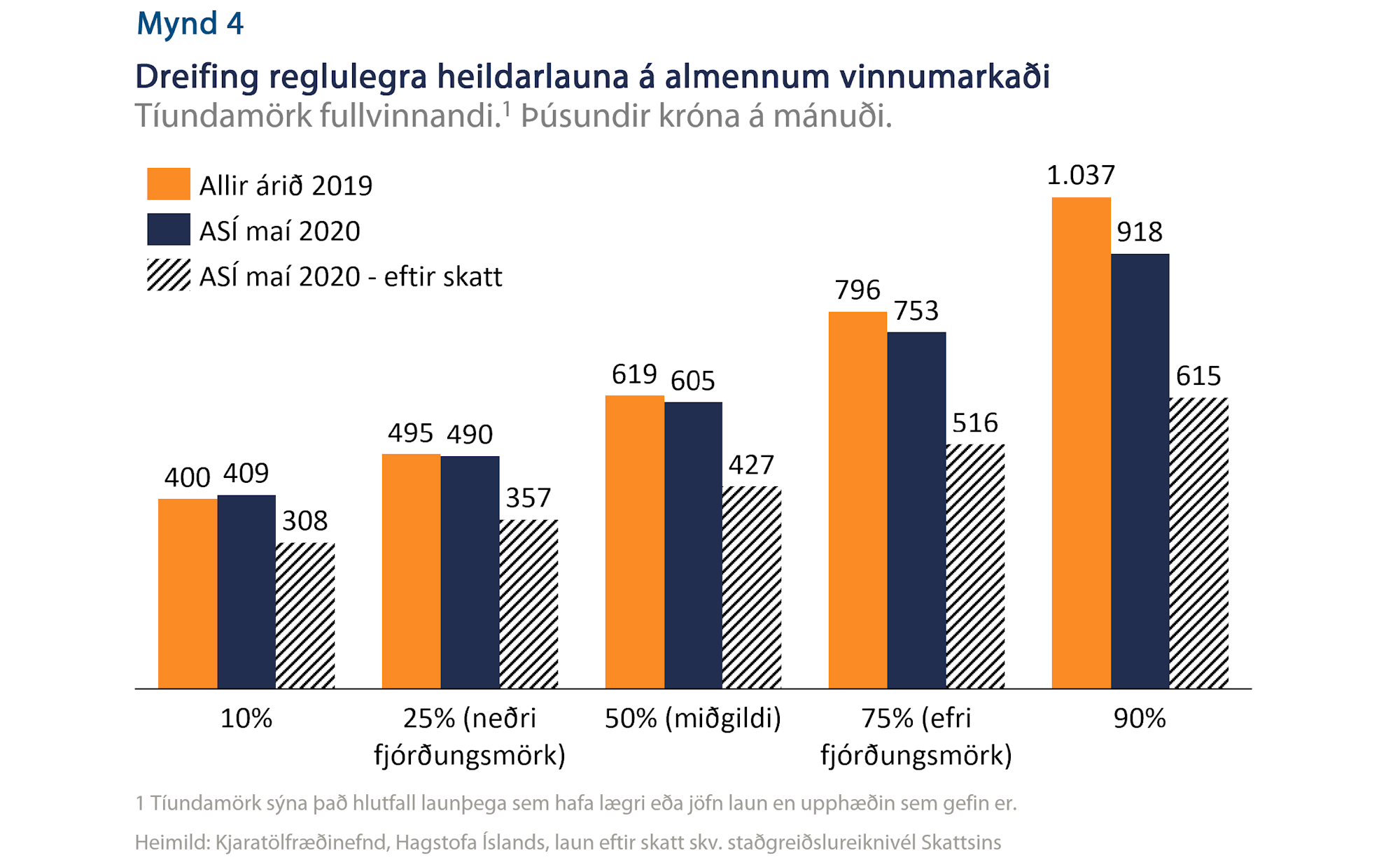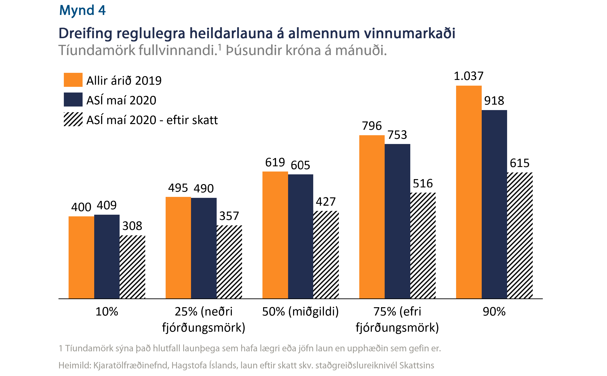 Í almennri umræðu um kjaramál er gagnlegt að horfa til dreifingar launa. Í því samhengi má í fyrsta lagi nefna að jöfnuður tekna á Íslandi er á alla mælikvarða með því mesta sem gerist meðal OECD ríkja. Í öðru lagi sýnir samanburður á tekjutíundum að jöfnuður ráðstöfunartekna hefur haldist nær óbreyttur í áratug og þar af minnkað á árunum 2017-2019. Í þriðja lagi má nefna að 90% fullvinnandi félagsmanna ASÍ á almennum vinnumarkaði er með regluleg heildarlaun yfir 409.000 krónur á mánuði og minna en helming munar á launum eftir skatt við 10% tíundamörk (mörk lægstu 10% og 20%) og 90% tíundamörk (mynd 4). Meginþorri launþega er í millitekjuhópum en sá hópur fær almenna launahækkun næstu áramót. Það dugar því ekki að fjalla einungis um áhrif hækkunar lægstu launa þar sem almenna hækkunin mun ráða mestu um launakostnað fyrirtækja.