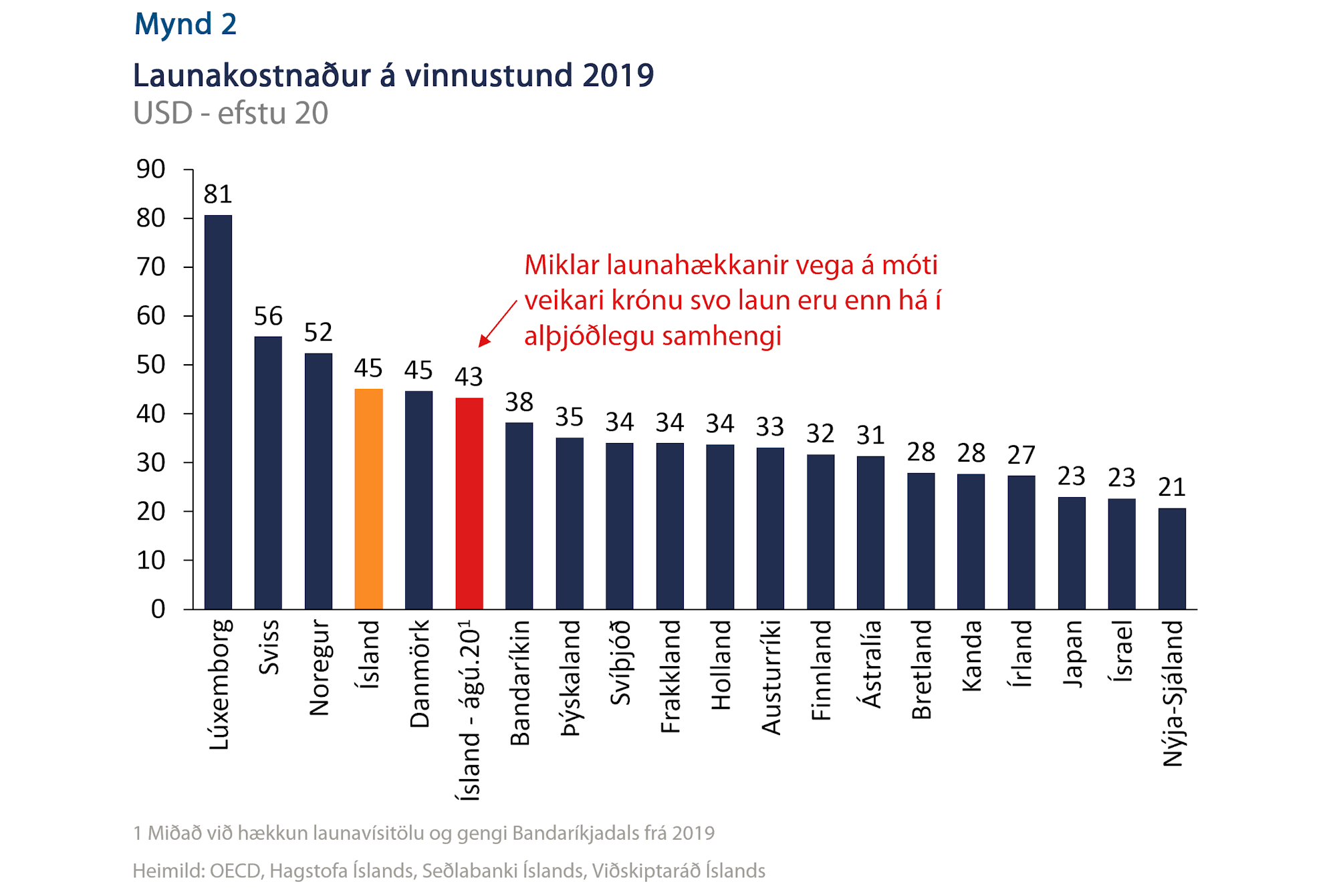 Í aðdraganda síðustu kjarasamninga benti Viðskiptaráð á að Ísland væri hálaunaland. Það er út af fyrir sig eftirsóknarvert að geta lifað við hátt launastig en engu að síður verða að vera efnahagslegar forsendur fyrir frekari launahækkunum. Í umræðunni virðist gleymast að þrátt fyrir veikingu krónunnar síðustu misseri er Ísland enn hálaunaland ef horft er á launakostnað á vinnustund meðal OECD ríkja. Árið 2019 var Ísland í 4. sæti og þótt erfitt sé að fullyrða um hvar Ísland lendir í ár verða áfram greidd hér ein hæstu laun í heimi á hverja vinnustund (mynd 2).