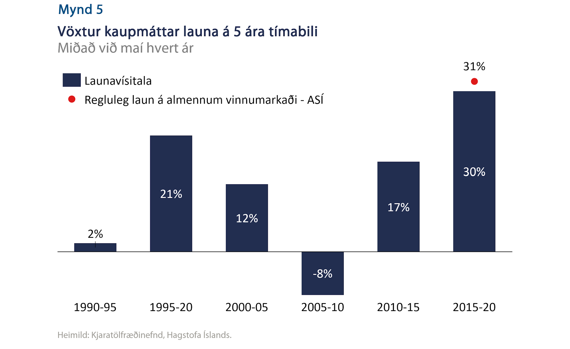 Kaupmáttur eykst eingöngu ef laun hækka umfram verðlag. Þannig fæst ekkert með launahækkunum ef allt sem þú borgar fyrir verður dýrara. Síðastliðin fimm ár hefur kaupmáttur launa aldrei vaxið jafn mikið (mynd 5). Veiking krónunnar hefur nú breytt þeim takti og hefur verðbólga færst upp á við á síðustu mánuðum. Vitað er að fyrirtæki voru byrjuð að finna fyrir auknum launakostnaði áður en kórónuveiran kom að landi. Ef almennar launahækkanir bætast ofan á veika krónu á sama tíma og tekjur dragast saman er einungis tímaspursmál hvenær slík þróun skilar sér í hærra verðlagi. Þannig myndu launahækkanir næstu áramóta ekki hafa tilætluð áhrif og þá tapa allir, fyrirtæki og launþegar í landinu.