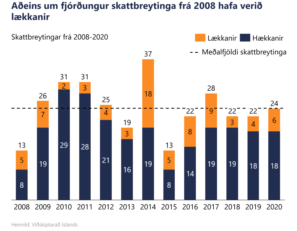 Um áramót tóku gildi 24 skattbreytingar samkvæmt úttekt Viðskiptaráðs, þar af 18 skatthækkanir og 6 lækkanir. Sé litið aftur til ársins 2007 hefur aðeins um fjórðungur skattbreytinga verið til lækkunar á sköttum eða 77 talsins af 313 breytingum. Þetta þýðir að fyrir hverja skattalækkun bætast að jafnaði þrjár til hækkunar. Alls voru 313 breytingar gerðar á tímabilinu þar af 236 skattahækkanir. Því má ætla að litlar breytingar verði á stöðu Íslands með næsthæstu skattbyrði (að undanskildum almannatryggingum) OECD ríkja.
