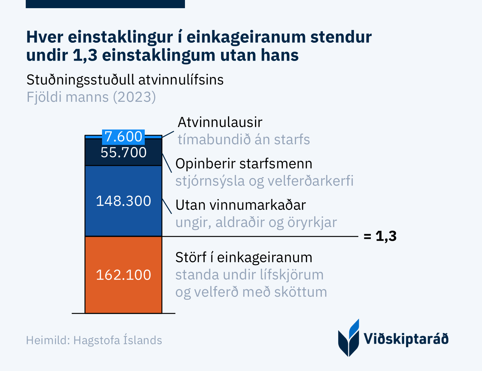 Stuðningsstuðull atvinnulífsins mælist 1,3 fyrir árið 2023 og lækkar á milli ára, þriðja árið í röð. Stuðullinn sýnir að fyrir hvern starfsmann í einkageiranum stóðu 1,3 einstaklingar utan hans. Síðarnefnda hópnum tilheyra þeir sem eru án atvinnu, í störfum hjá hinu opinbera eða utan vinnumarkaðar. Því hærri sem stuðullinn er, því fleiri einstaklingum stendur hvert stöðugildi í einkageiranum undir, sem felur almennt í sér aukna skattbyrði.