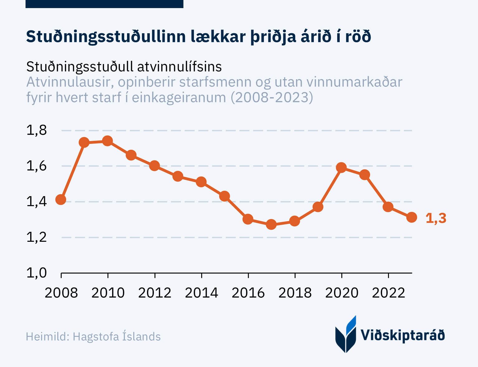 Fjölgun starfa í einkageiranum veldur því að stuðningsstuðull atvinnulífsins lækkar þriðja árið í röð. Stuðullinn stendur nú í 1,3, sem þýðir að fyrir hvern einstakling í einkageiranum standa nú 1,3 einstaklingar utan hans. Viðskiptaráð hefur birt stuðulinn frá árinu 2011 til að meta jafnvægi á milli umsvifa einkageirans og annarra hluta hagkerfisins.