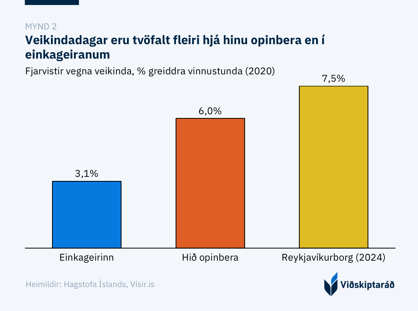 Fjarvera opinberra starfsmanna vegna veikinda er tvöfalt algengari en í einkageiranum. Um 6% greiddra vinnustunda opinberra starfsmanna eru vegna veikindafjarvista, samanborið við 3,1% í einkageiranum (mynd 2). Tölur frá Hagstofunni sýna að meðalfjöldi veikindadaga í einkageiranum voru 8 dagar á meðan veikindadagar hjá hinu opinbera voru 16 dagar, eða tvöfalt fleiri. [3]